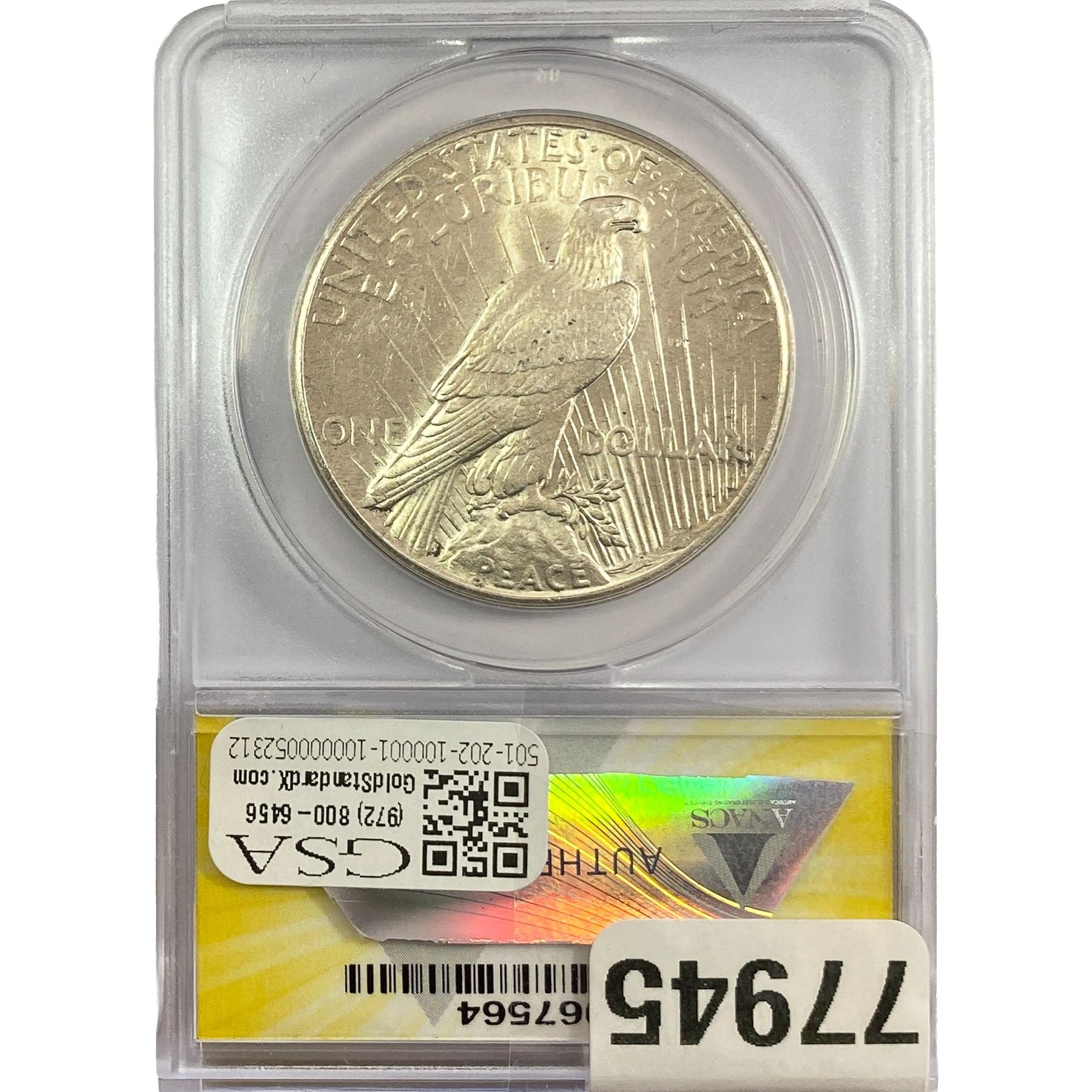 e. Coins sold referencing a third-party grading service are sold “AS IS” without any express or implied warranty, except for a guarantee by GSA that they are genuine. Removal or alteration of the holder, voids all of Bidder’s claims concerning that Product. Certain warranties may be available from the grading services and Bidders are referred to them for further details: Numismatic Guaranty Corporation (NGC), PO Box 4776, Sarasota, FL 34230, www.ngccoin.com/services/writtenguarantee.asp; Professional Coin Grading Services (PCGS), PO Box 9458, Newport Beach, CA 92658, www.pcgs.com/guarantee.html; ANACS, 6555 S. Kenton St., Ste. 303, Englewood, CO 80111; and Independent Coin Grading Co. (ICG), 7901 East Bellview, Ave., Suite 50, Englewood, CO 80111.