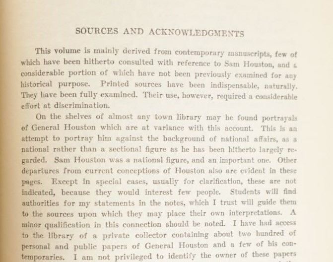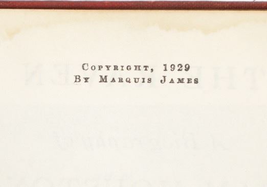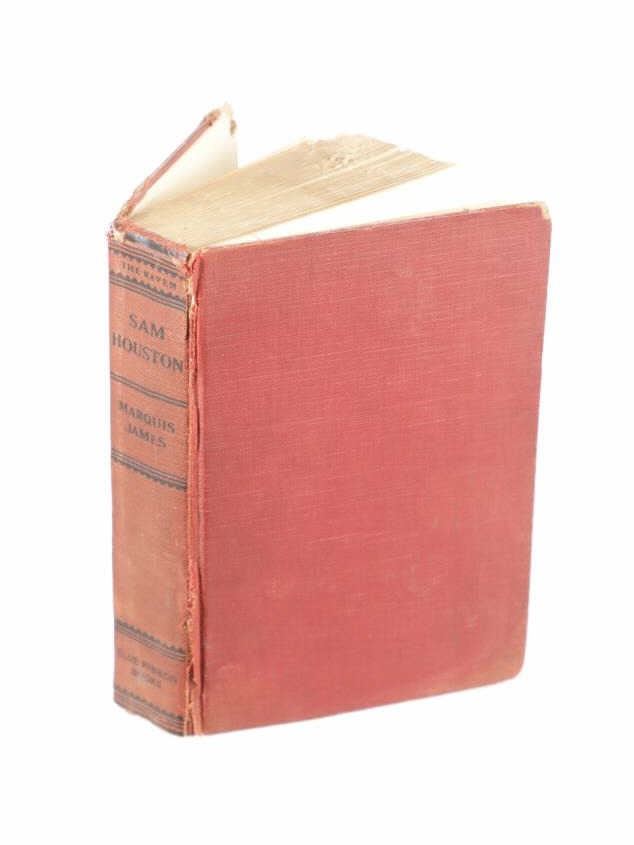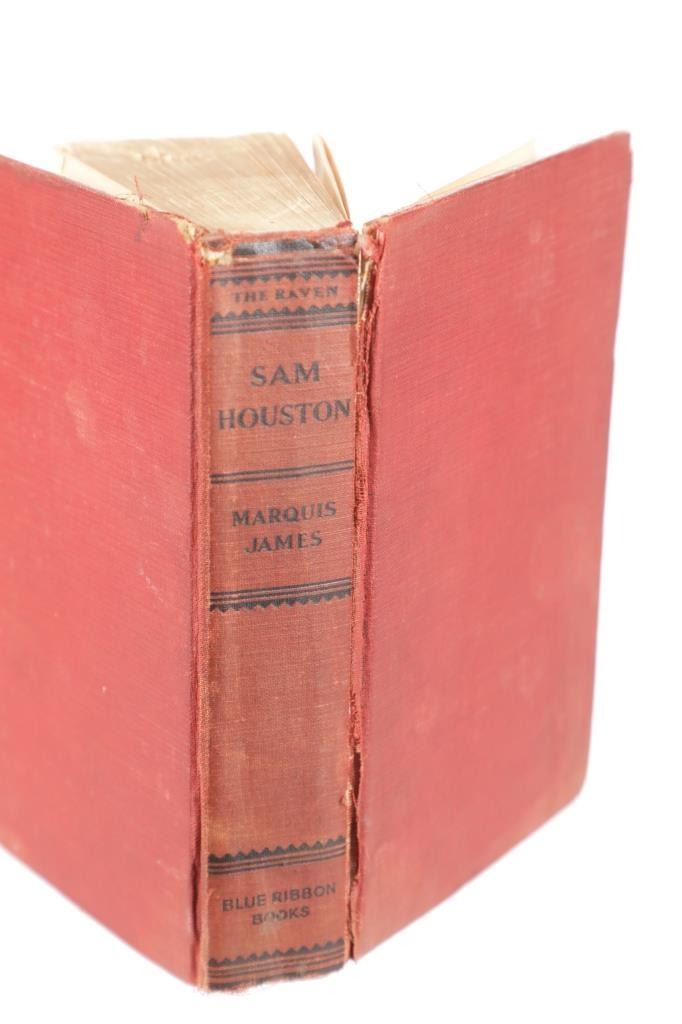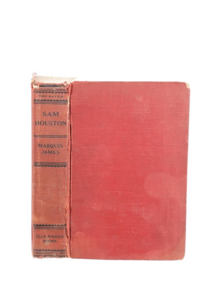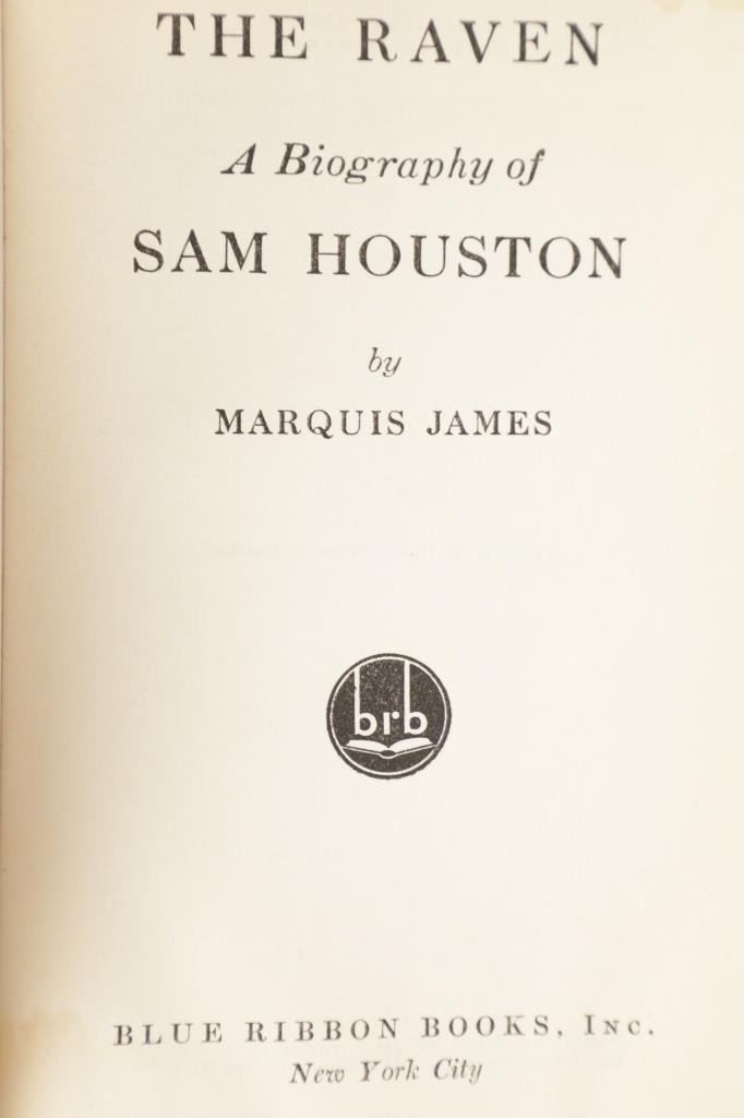 Featured in this lot is this 1929 First Edition of "The Raven A Biography of Sam Houston" by Marquis James, Blue Ribbon Books, Inc. New York City, publisher. Samuel Houston (1793 – 1863) was an American general and statesman who played an important role in the Texas Revolution. He served as the first and third president of the Republic of Texas and was one of the first two individuals to represent Texas in the United States Senate. He also served as the sixth governor of Tennessee and the seventh governor of Texas, the only individual to be elected governor of two different states in the United States. Marquis James was an American journalist and author, twice awarded the Pulitzer Prize for his works. The red cloth bound hardcover exhibits scuffing and staining, spine loose at both joints. Intact deckled bottom and fore edge pages exhibit age tanning, foxing and top edge scuffing to rear pages. Measures 5.5"W x 8.25"L x 1.5"D.