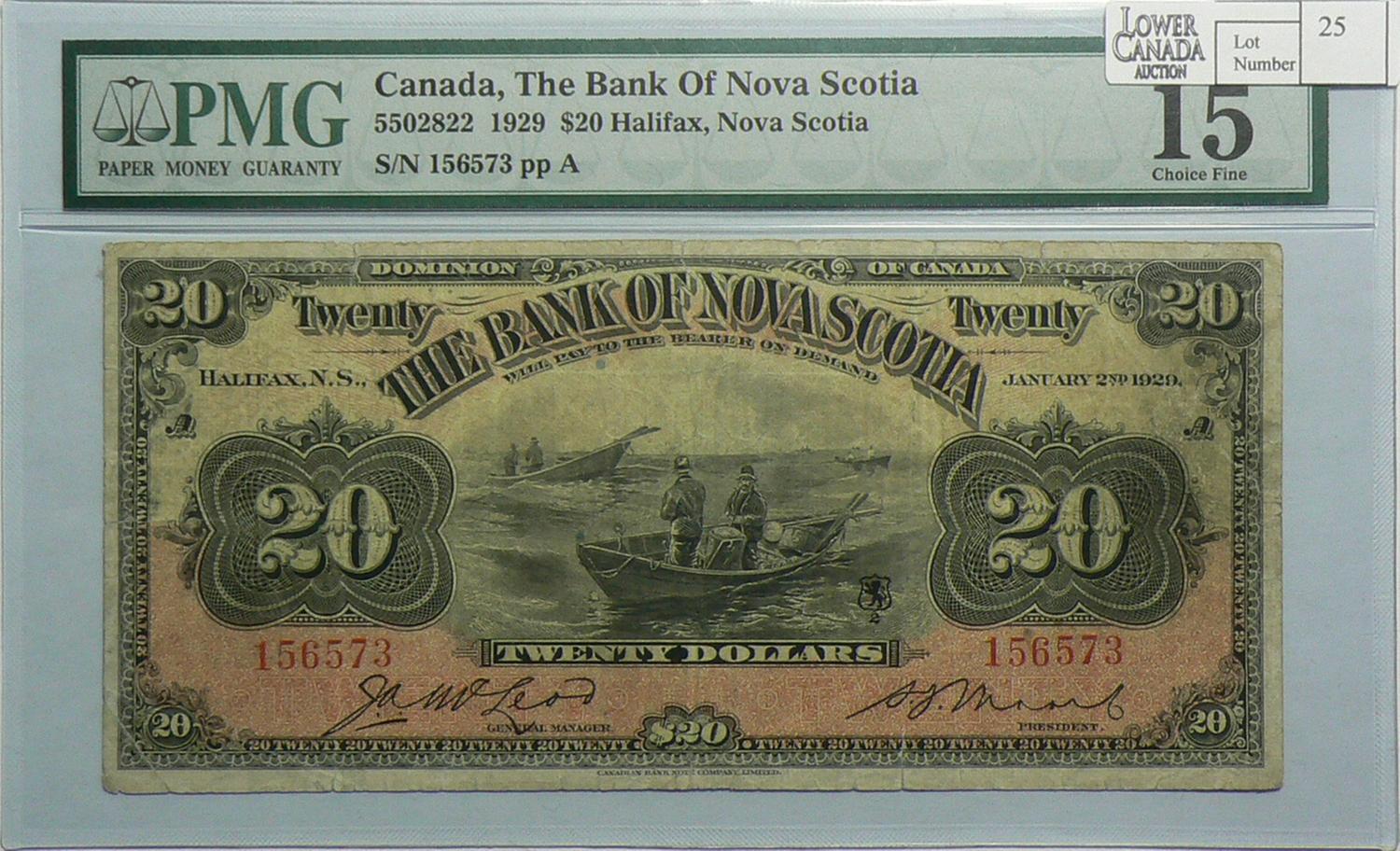 1929 Twenty Dollars Bank of Nova Scotia, 550-28-22, PMG F-15, McLoed Moore, Letter A, serial 156573.