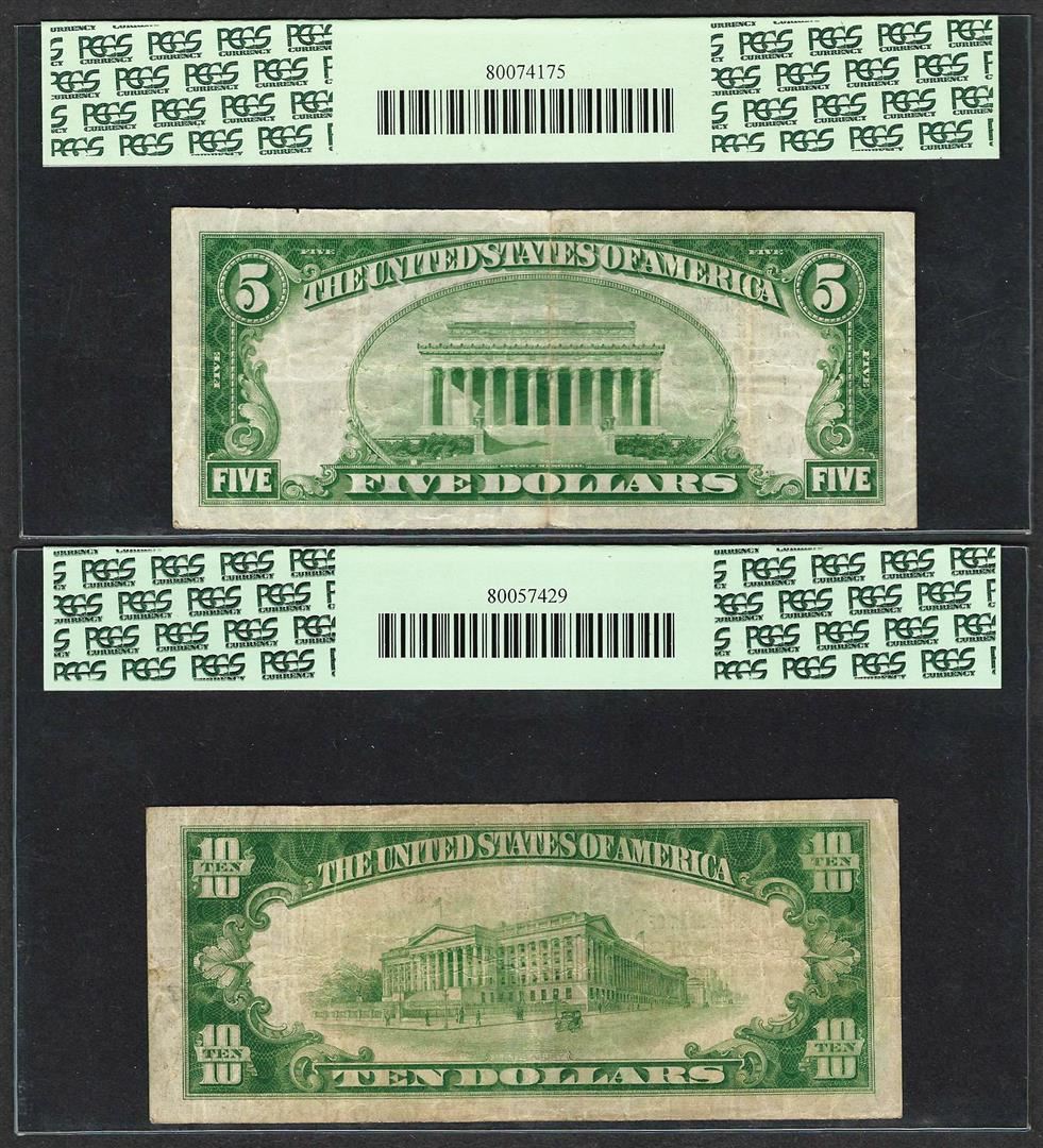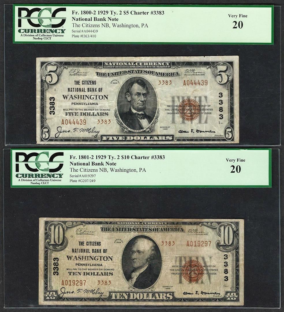 1929 Ty. 2 $5/10 Citizens NB Washington, PA CH# 3383 National Currency Notes PCGS VF20