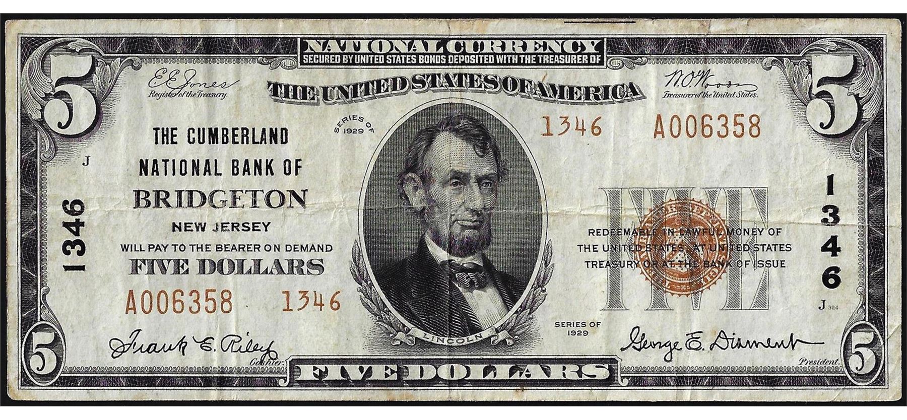 One 1929 Ty. 2 $5 The Cumberland NB of Bridgeton, NJ CH# 1346 National Currency Note.