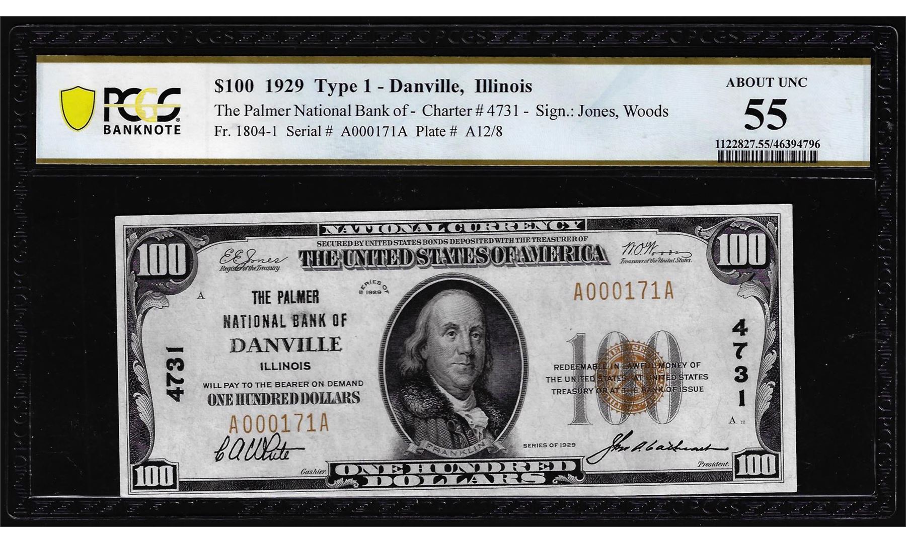 One 1929 Type 1 $100 NB of Danville, IL CH# 4731 National Currency Note PCGS About UNC 55. PCGS Graded.