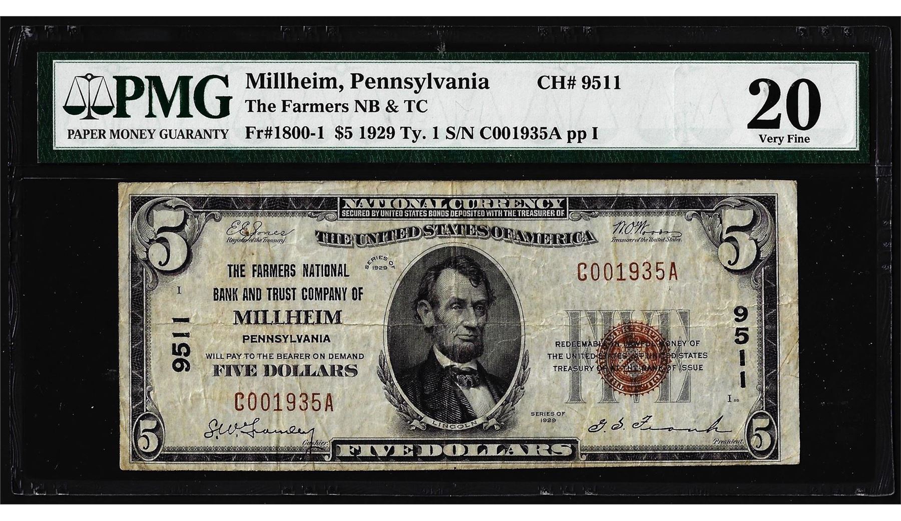 One 1929 Type 1 $5 Millheim, PA CH# 9511 National Currency Note PMG Very Fine 20. PMG Certified.