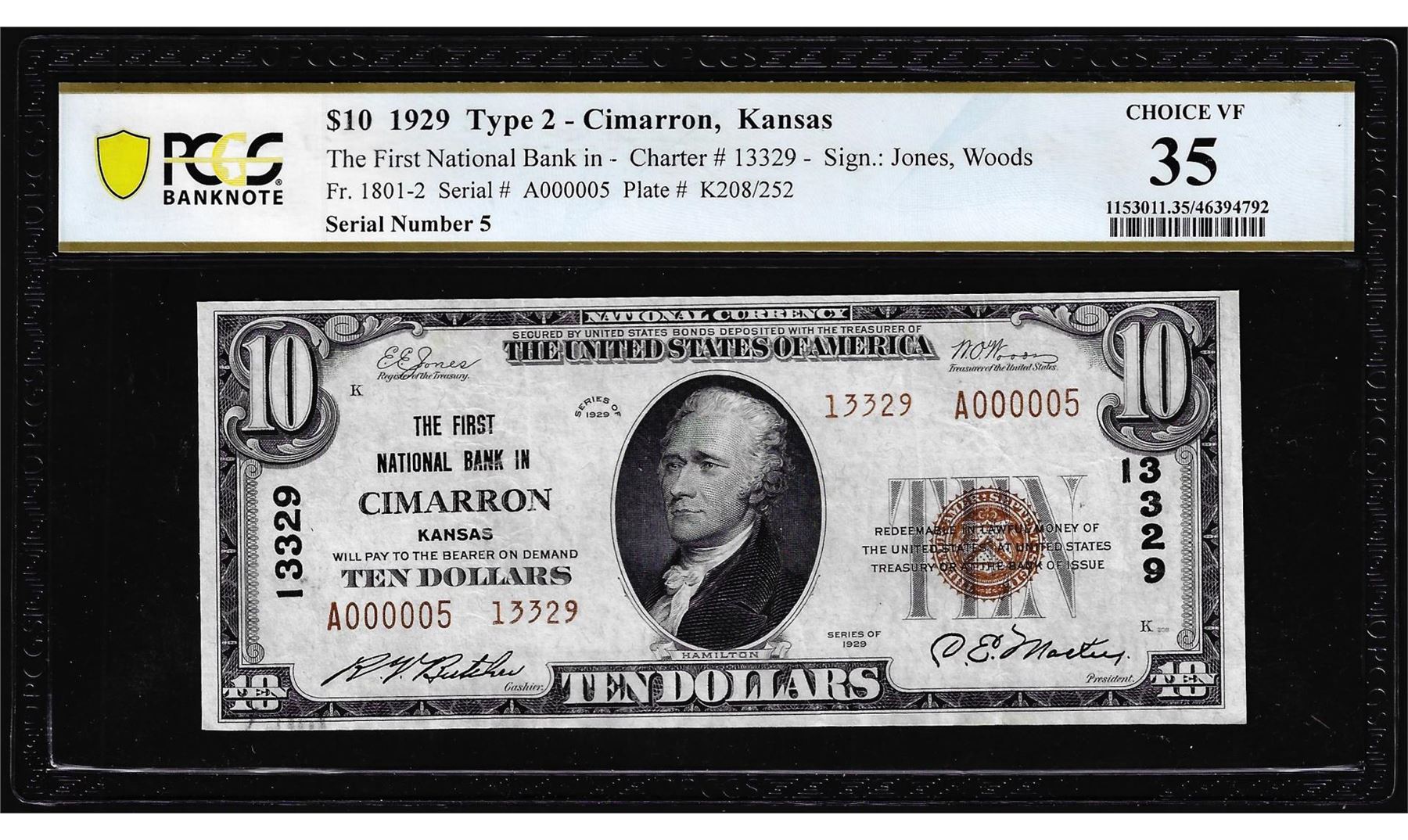 One 1929 Type 2 $10 NB of Cimarron, KS CH# 13329 National Currency Note PCGS Choice VF 35. PCGS Graded.