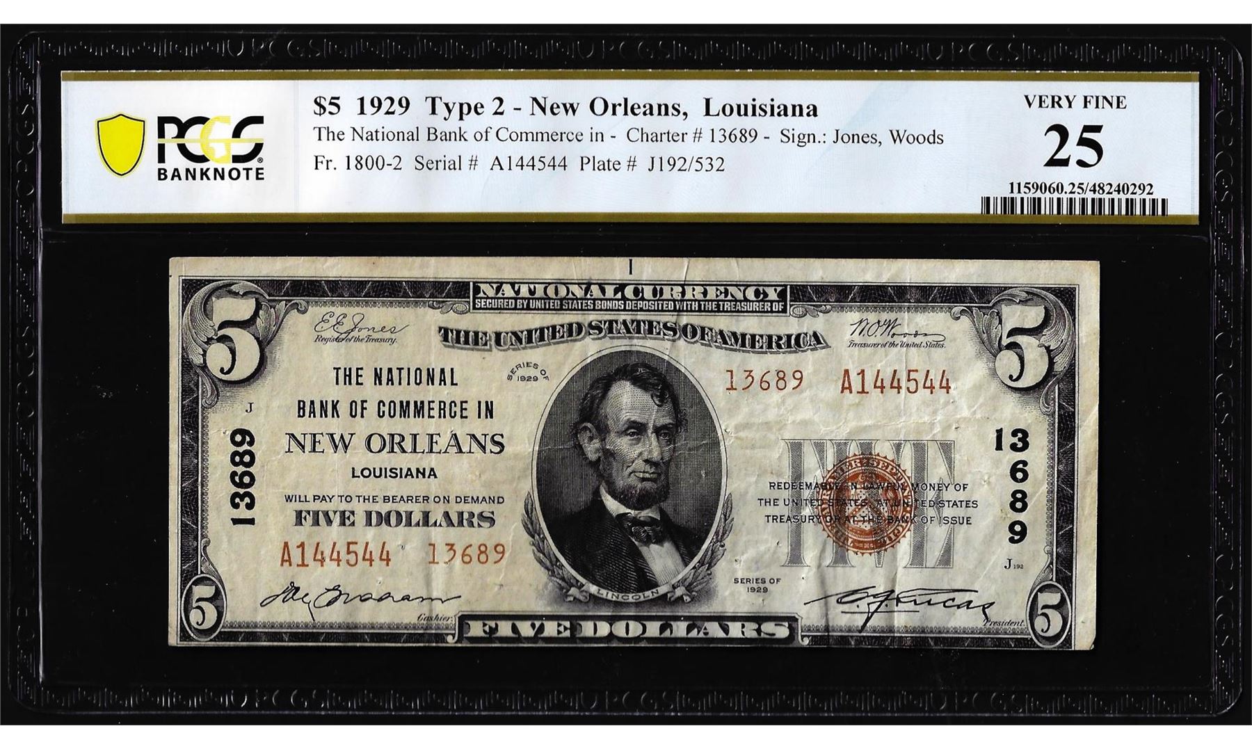 One 1929 Type 2 $5 NB New Orleans, LA National Currency Note CH# 13689 PCGS Very Fine 25. PCGS Graded.