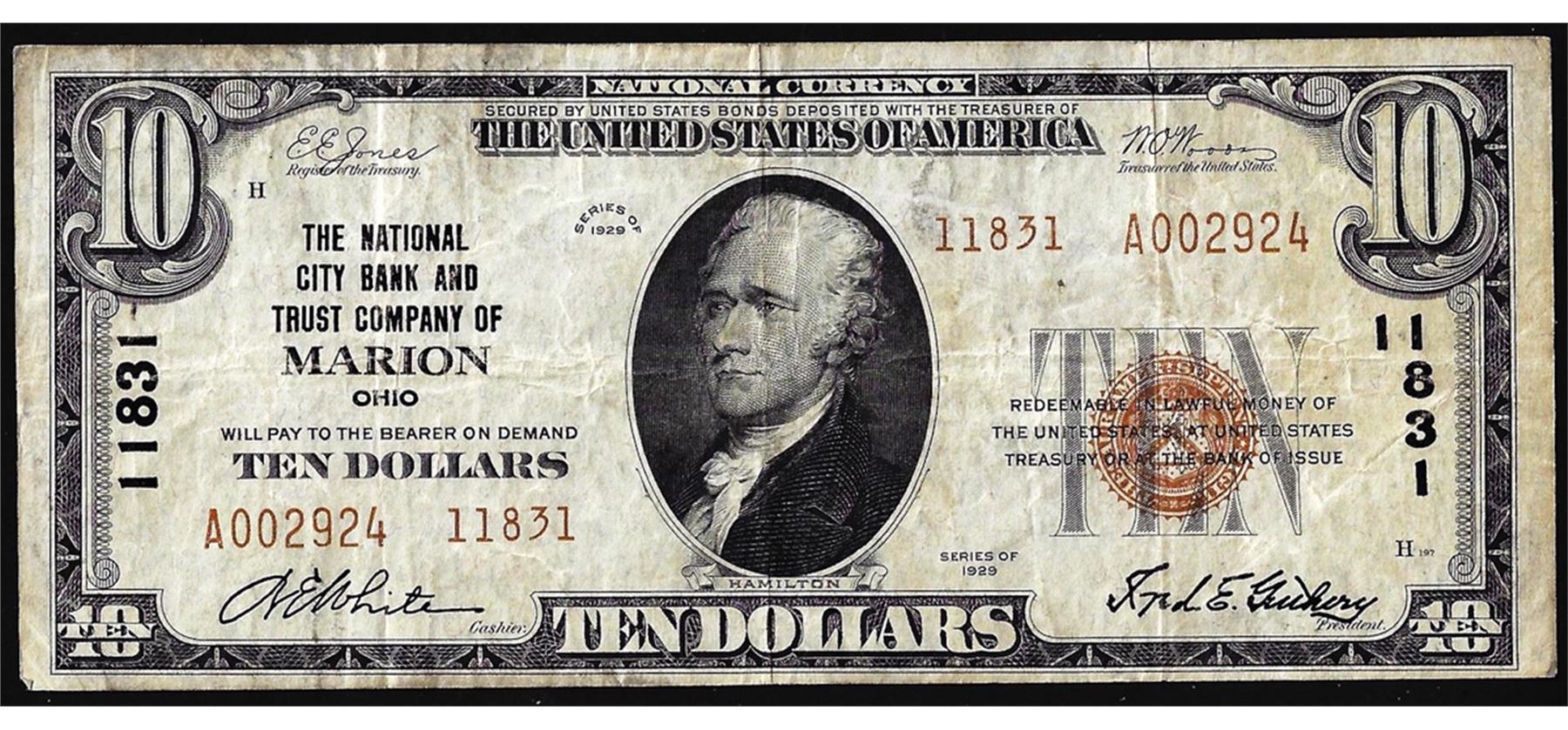 One 1929 Type II $10 Marion, OH CH# 11831 National Currency Note.