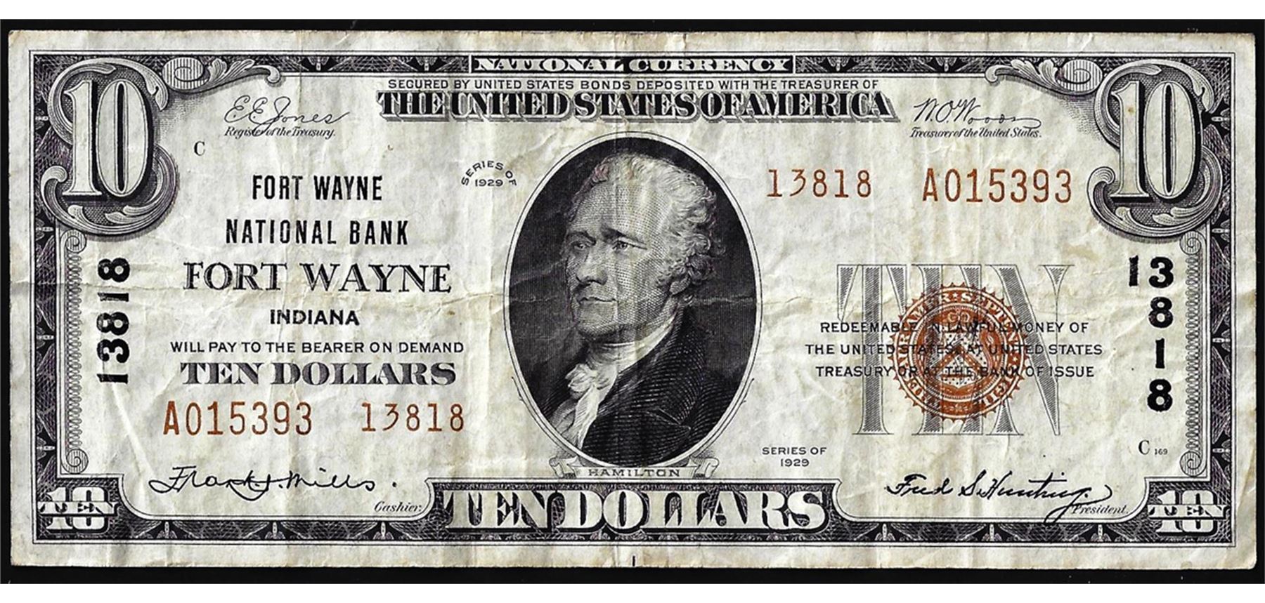One 1929 Type II $10 NB Fort Wayne, IN CH# 13818 National Currency Note.