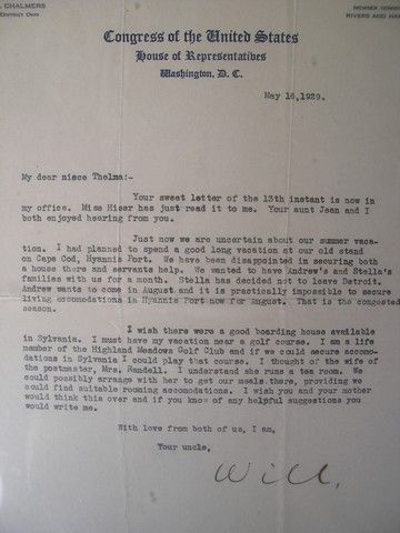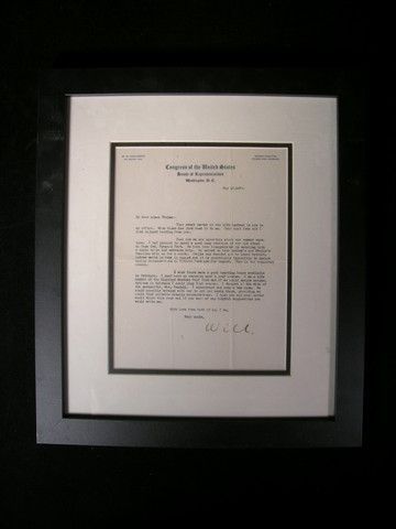 Vintage 1929 Congress of the USA framed letter by W.W. Chalmers to his niece Thelma signed "Uncle Will". (17x15) Oversized item. Additional Postage Required.