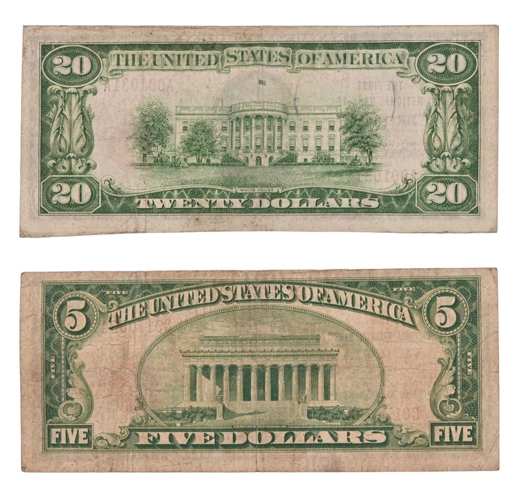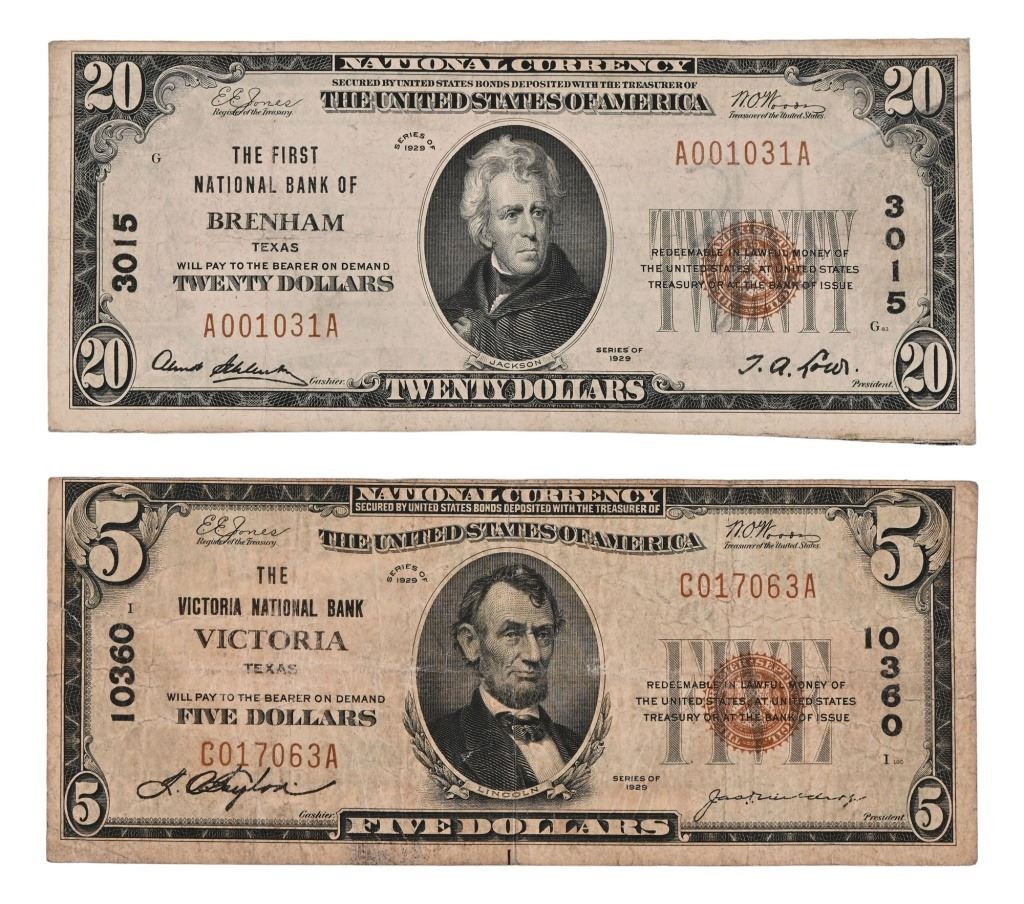 Brenham National Bank $20 Note. Victoria National Bank $5 Note.