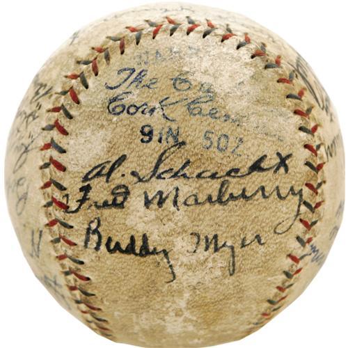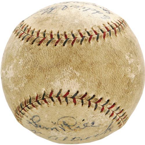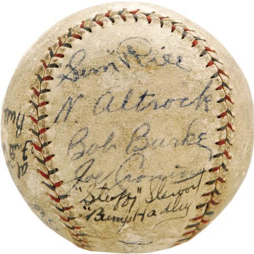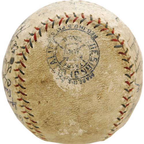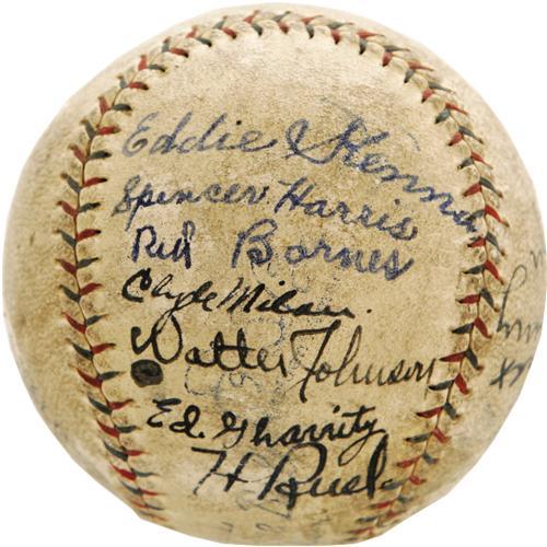 <B>1929 Washington Senators Team Signed Baseball.</B></I> While the club could never recapture the pennant after back-to-back American League Championships in the mid-1920's, many of the team's top stars were still on staff at the time this OAL (Barnard) ball was signed. Most appealing is the eastern panel, which features 10/10 black fountain pen signatures of the famous Washington Senators battery Walter Johnson and Muddy Ruel. Noteworthy names on other panels include Rice, Cronin, Altrock, Hadley and Marberry. Signature quality is spectacular for a baseball of this vintage, with none of the sixteen signatures present dipping below 7/10 in strength. It must be noted that a couple of the autographs are not 1929 Senators, perhaps coaches or visiting players. The young former owner of the baseball has innocently penned his name over the OAL stamping, though this is noted only for the sake of accuracy. Clearly the tremendous quality of the talent, and the signatures they provide, override any minor concerns. Tattered original Reach box is included. <I>LOA from PSA/DNA.</B></I>
