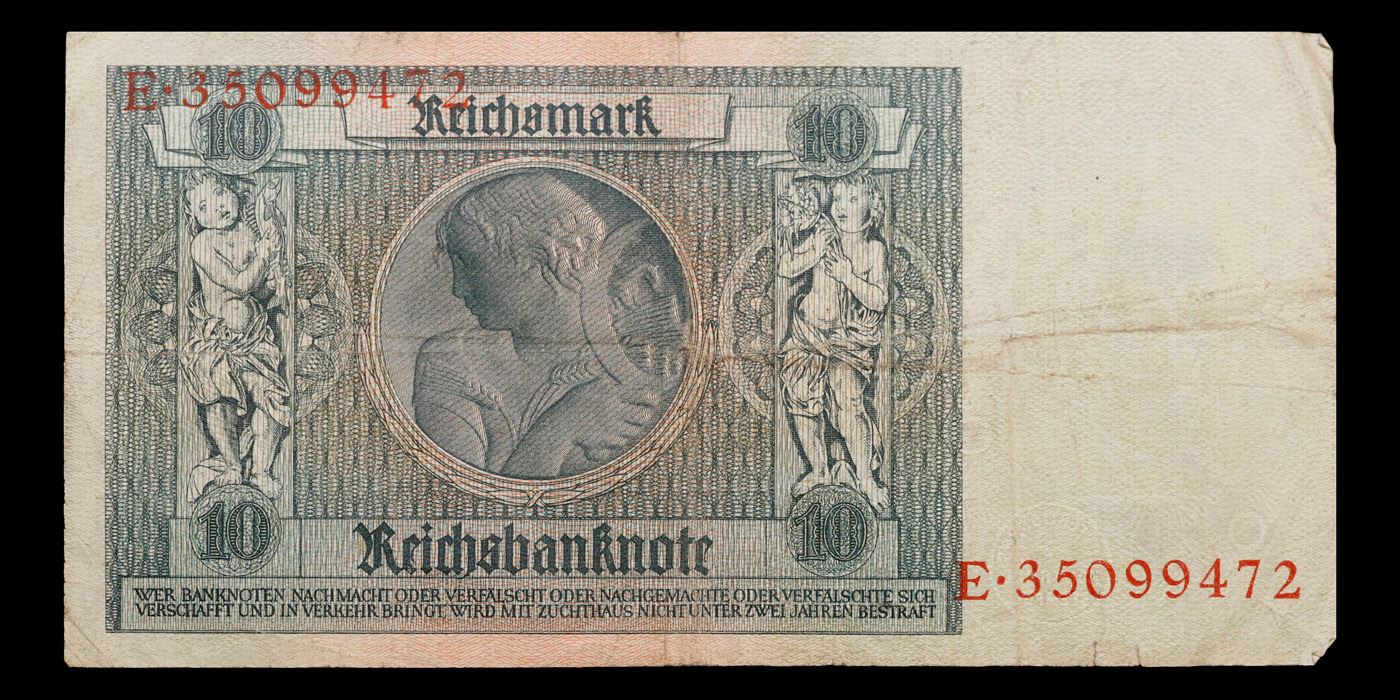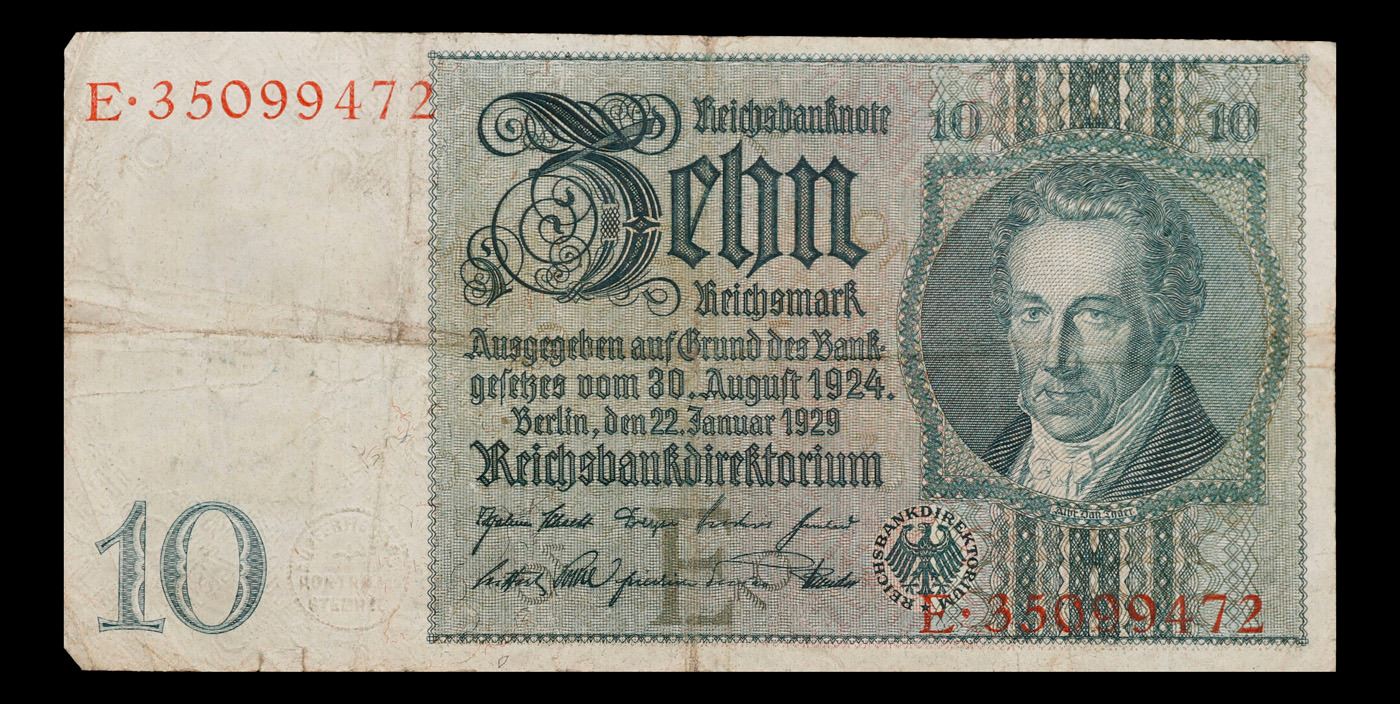 1929 Weimar Germany 10 Richmark Note P: 180A Grades vf+. The Reichsmark was introduced in 1924 as a permanent replacement for the Papiermark. This was necessary due to the 1920s German inflation which had reached its peak in 1923. The exchange rate between the old Papiermark and the Reichsmark was 1 ?? = 1012?? (one trillion in American English and French, one billion in German and other European languages and British English of the time; see long and short scale). To stabilize the economy and to smooth the transition, the Papiermark was not directly replaced by the Reichsmark, but by the Rentenmark, an interim currency backed by the Deutsche Rentenbank, owning industrial and agricultural real estate assets. The Reichsmark was put on the gold standard at the rate previously used by the Goldmark, with the U.S. dollar worth 4.20 ??.