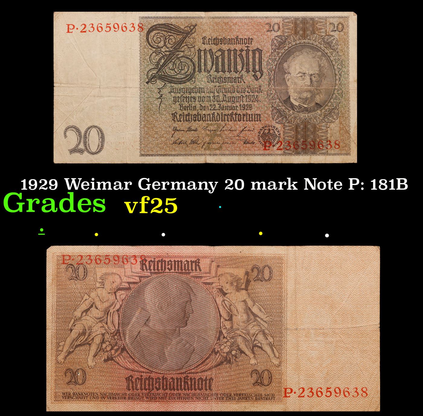 1929 Weimar Germany 20 mark Note P: 181B Grades vf+. In the early 1920s, post-WWI Germany saw its economy spiraling out of control. Hyperinflation started directly after the war in 1918, but truly took over the Weimar Republic from 1921 to 1923. The value of the Mark declined incredibly rapidly. 1 USD was equal to 50 German Marks at the beginning of 1920. Toward the end of 1923, 1 USD was equal to over 4,200,000,000,000 German Marks. At times, denominations of the Mark became less valuable than the paper and labor to print it almost immediately after printing. Thus, denominations of the Mark notes became incredibly large, ending up in the tens of trillions.