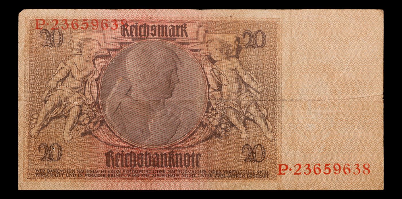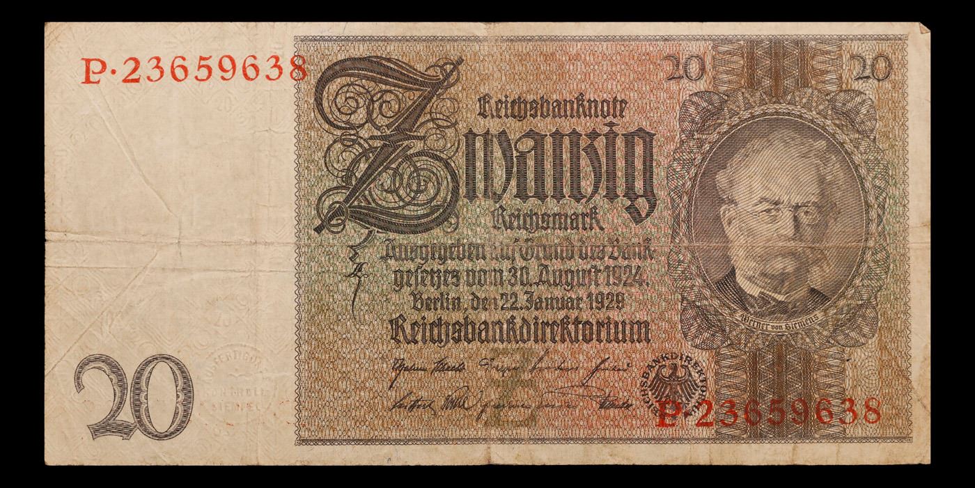 1929 Weimar Germany 20 mark Note P: 181B Grades vf+. In the early 1920s, post-WWI Germany saw its economy spiraling out of control. Hyperinflation started directly after the war in 1918, but truly took over the Weimar Republic from 1921 to 1923. The value of the Mark declined incredibly rapidly. 1 USD was equal to 50 German Marks at the beginning of 1920. Toward the end of 1923, 1 USD was equal to over 4,200,000,000,000 German Marks. At times, denominations of the Mark became less valuable than the paper and labor to print it almost immediately after printing. Thus, denominations of the Mark notes became incredibly large, ending up in the tens of trillions.