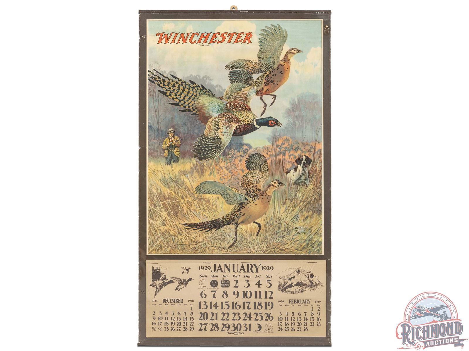 Beautiful lithograph paper advertising calendar sign featuring a colorful game scene of one male and two female ring-neck pheasants, a Pointer dog and hunter by artist Lynn Bogue Hunt. This calendar presents well with a few creases and tears, predominately on the left edge. Some general edge wear mostly along the bottom right edge plus one spot on the top right corner with tape residue attached. Includes top and bottom bands with full calendar pad. Marked Copyright 1929 by Winchester Repeating Arms Co Litho USA. 26.25" H x 15" W.