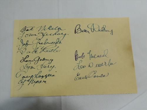 1929 YANKEES CUT 12 SIGNATURES AUTOGRAPHS. BABE RUTH, LOU GEHRIG, LEO DUROCHER, EARLE COMBS, BILL DICKEY AND JOHN GRABOWSKI. NO COA. AS SHOWN. VIEW PICTURE FOR DETAIL.