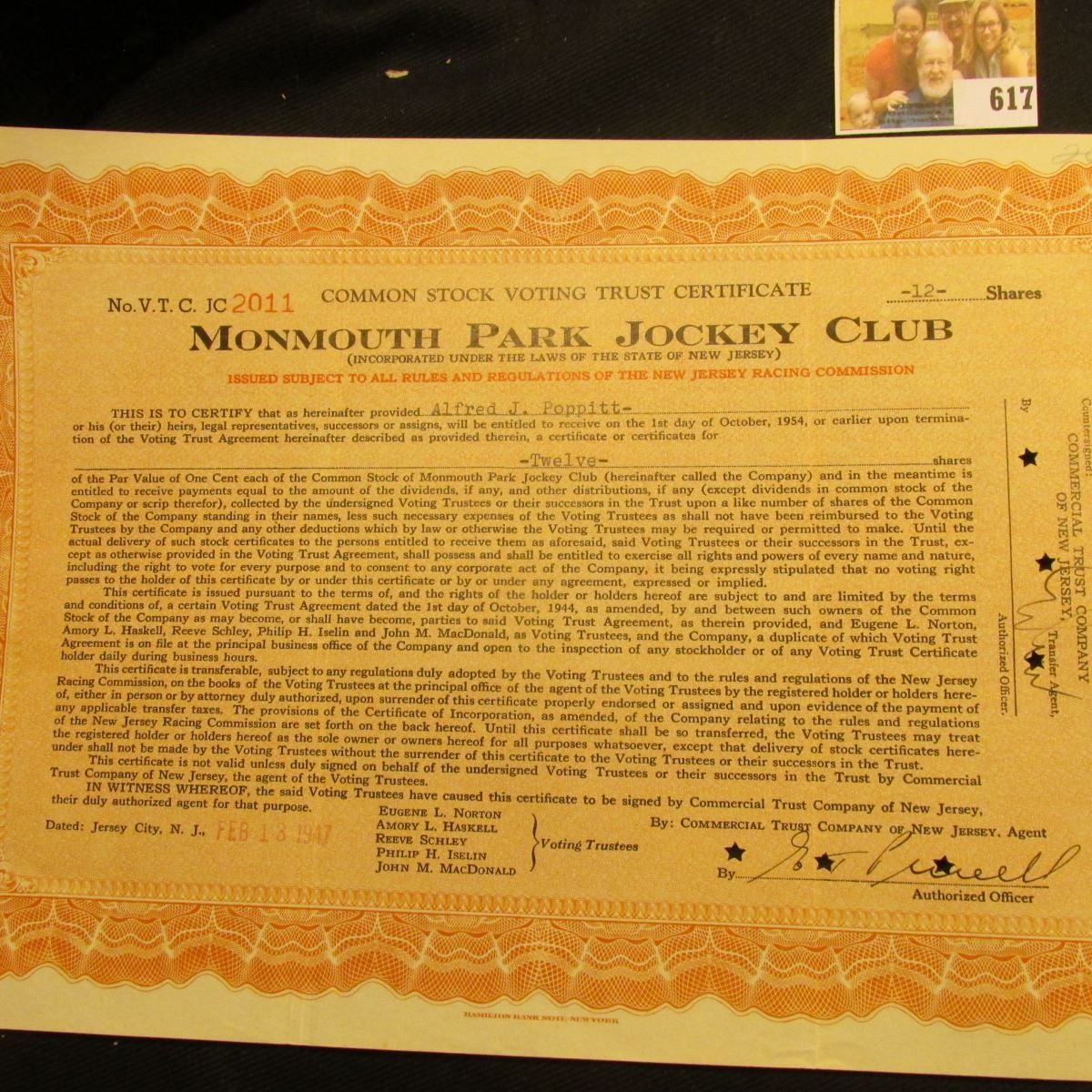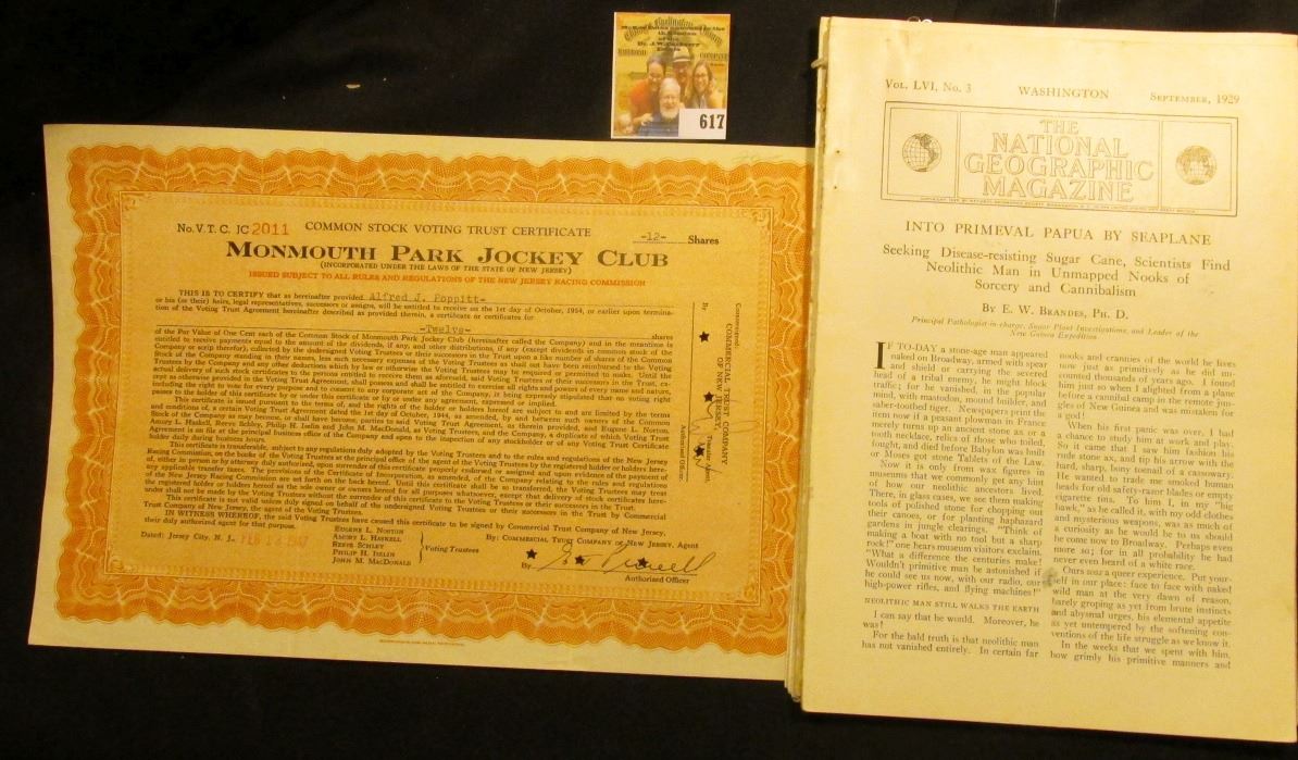 1929 issue (partial) "The National Geographic Magazine" includes numerous photos of Holland, old Cars, and etc.; & 1947 Stock Certificate for 12 Shares of "Monmouth Park Jockey Club" Common Stock Voting Trust Certificate.