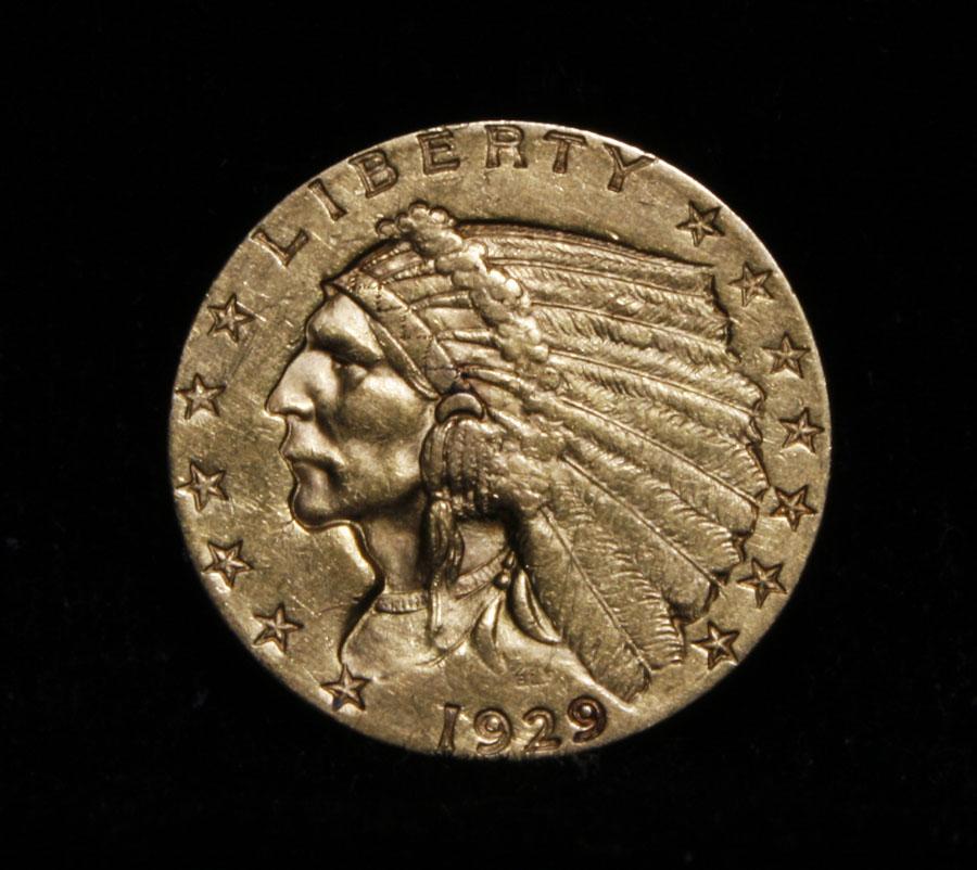 The $2 1/2 and $5 Indian are the first incuse designed coins since ancient times. This is a great example of the 1929-p. Coin World's Coin Values lists ms63 at $1100 and The Wholesale Greysheet lists ms63 at $800. Estimated Value $950
