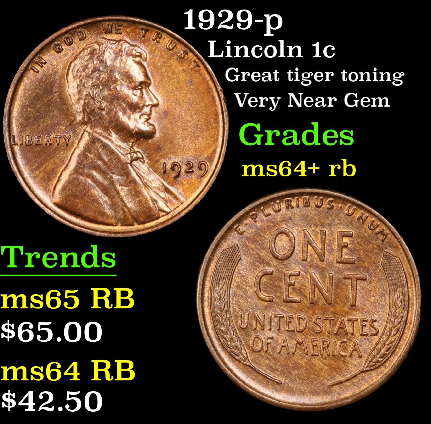 1929-p Great tiger toning Very Near Gem Lincoln Cent 1c Grades Choice+ Unc RB.
