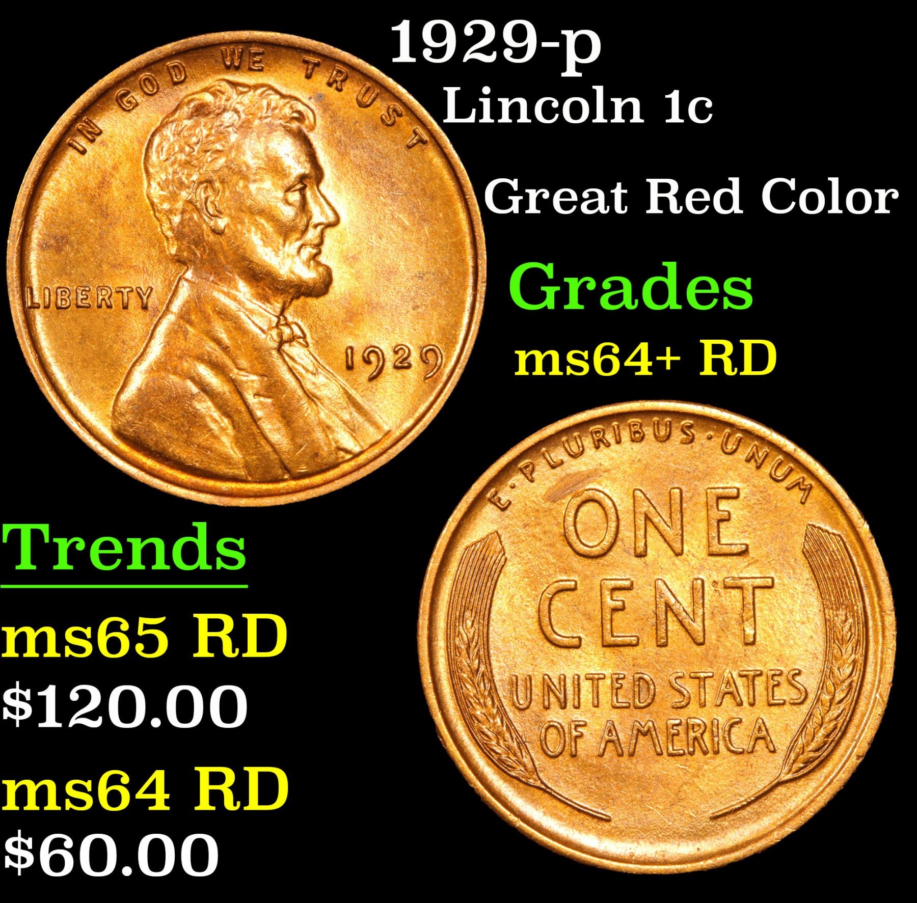 1929-p Lincoln Cent 1c Grades Choice+ Unc RD. Great Red Color