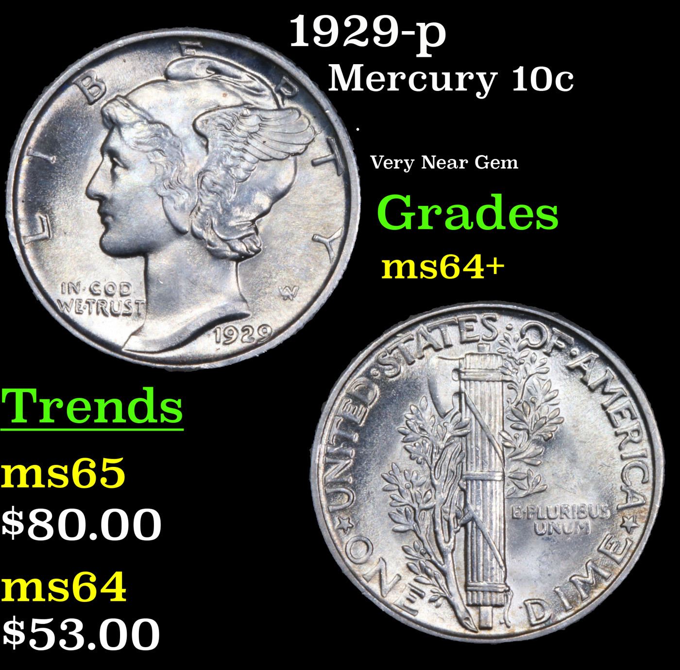 1929-p Mercury Dime 10c Grades Choice+ Unc.