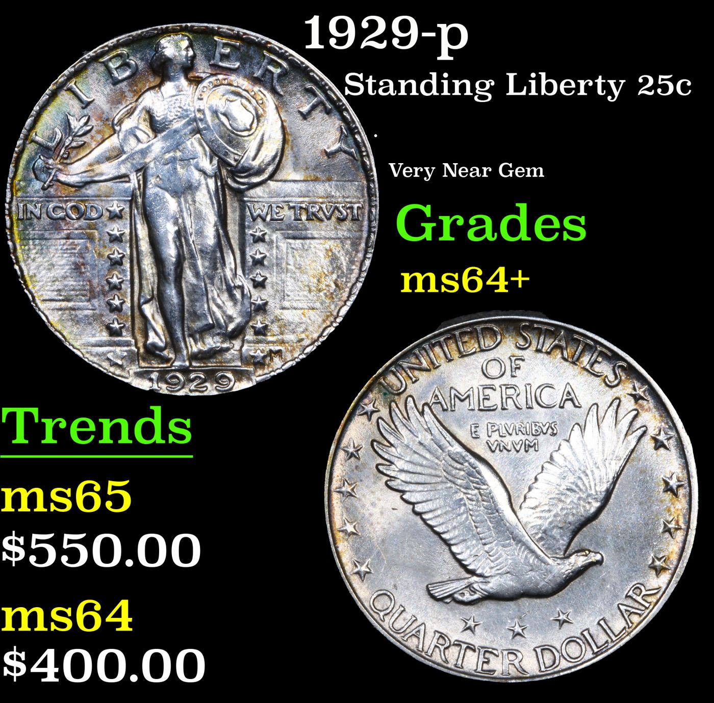 1929-p Standing Liberty Quarter 25c Grades Choice+ Unc.