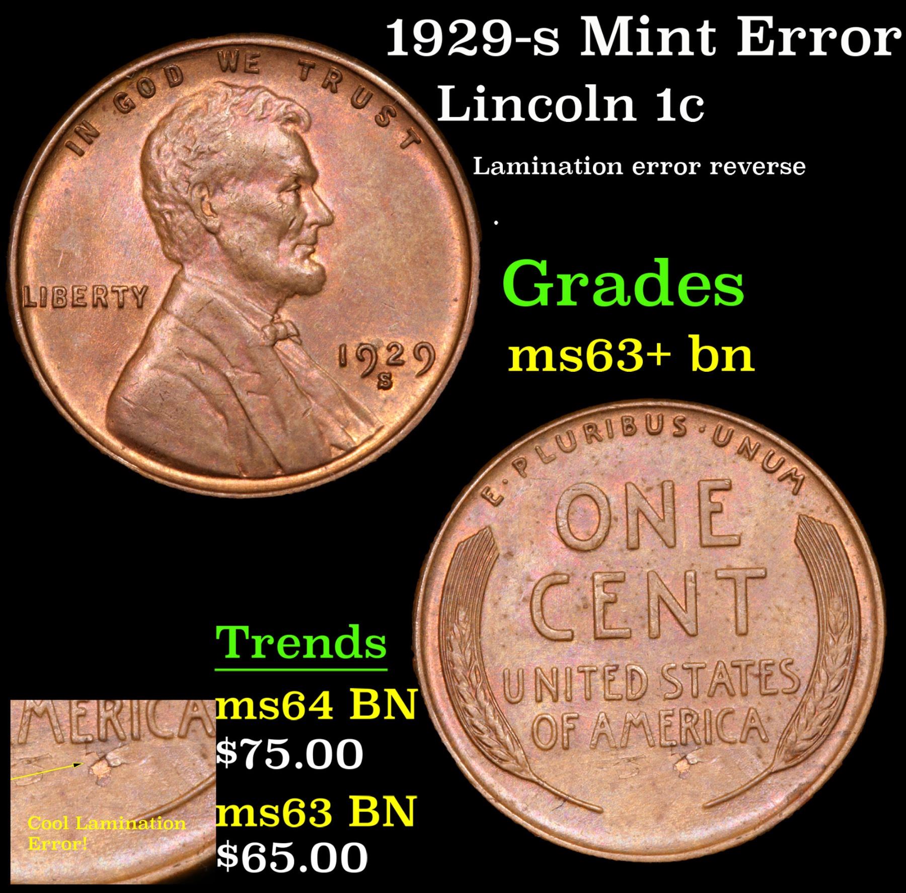 1929-s Mint Error Lamination error reverse . Lincoln Cent 1c Grades Select+ Unc BN. A Corey's Pick