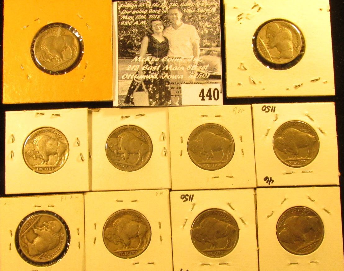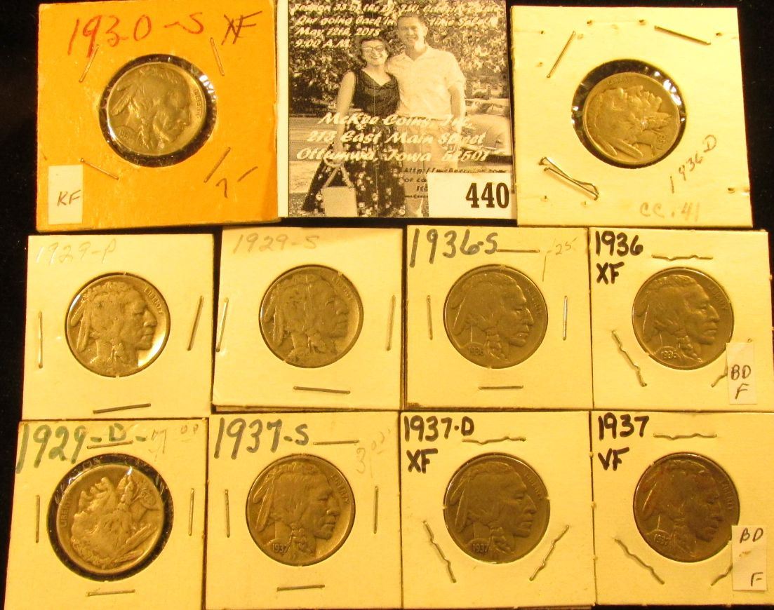 1929P, D, S, 30S, 36P, D, S, 37P, D, & S Buffalo Nickels, all carded with grades up to VF-EF.