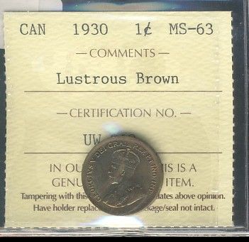 1930 1¢ ICCS MS-63 Lustrous Brown.