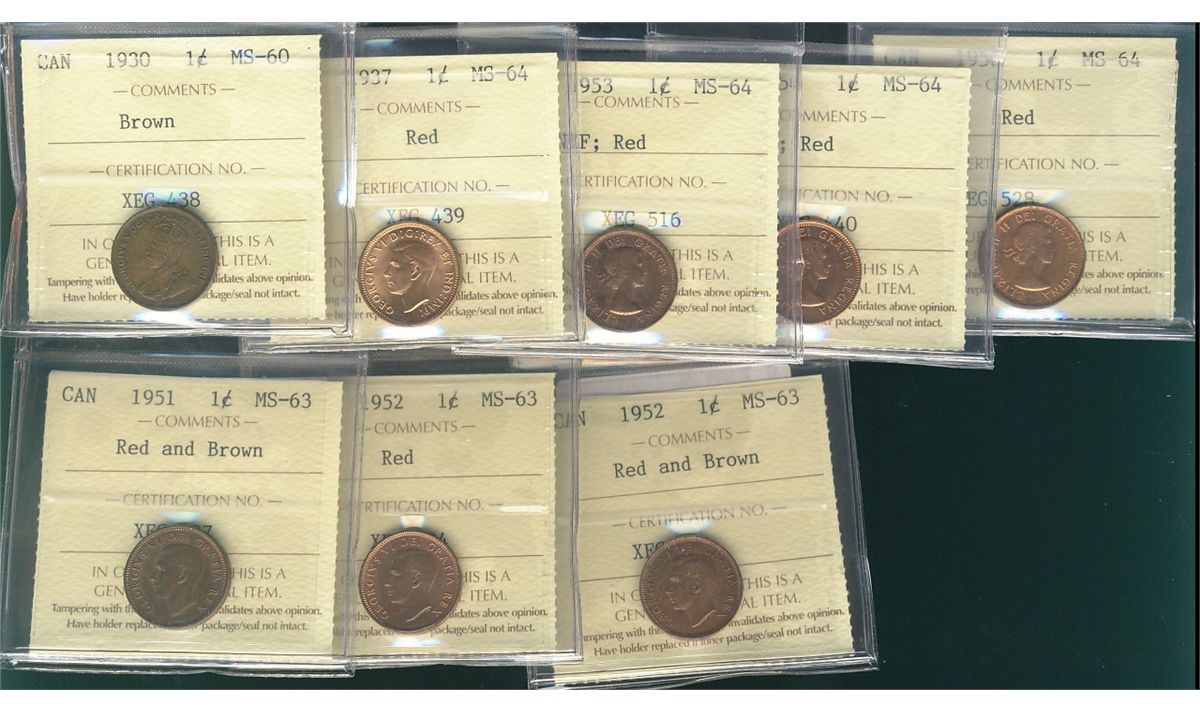 1930 1¢ MS60, 1937, 1953 NSF, 1954 SF, 1956 MS64RD & 1951, 1952(2) MS63. Lot of 8 ICCS graded coins.