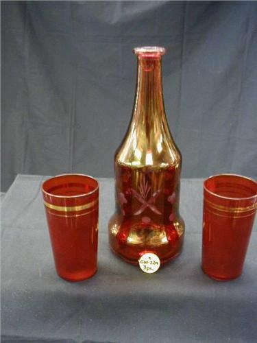 1930 (1) RUBY FLASH CUT WORK DECANTER 10 3/4in (2) 1920 4 3/4in RUBY TUMBLERS W/GOLD BANDS EXCELLENT 3 PC