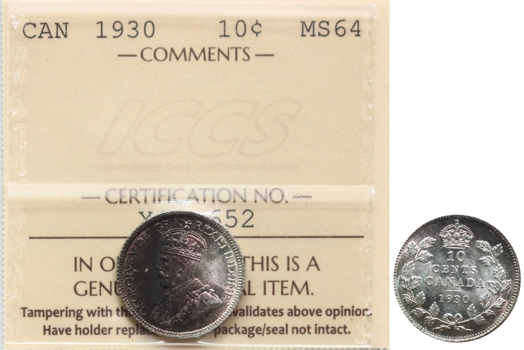 1930 10¢ ICCS Very Choice Mint State-64 intense toning over full underlying lustre