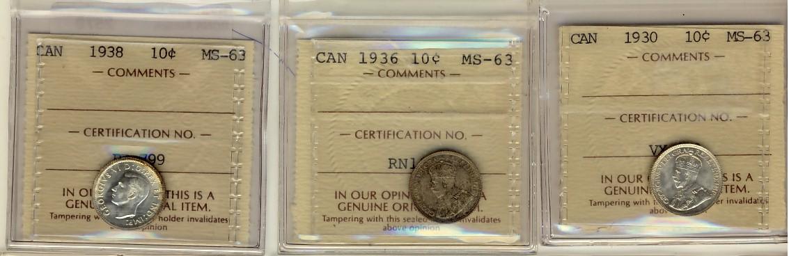 1930, 1936 & 1938 10¢ ICCS MS63. Lot of 3 coins both in old ICCS holders.