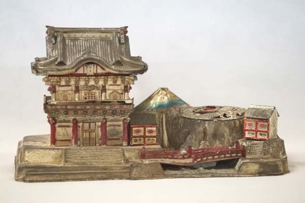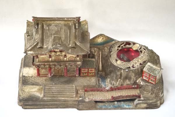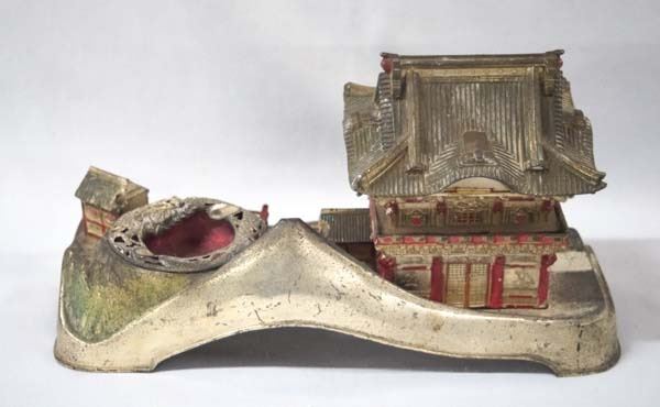 1930-1940 Chinese Cast Metal Smoking Tray, measures 5'' x 7'' x 12''L, the large house's roof opens up and is a cigarette compartment, the two smaller houses are removable, one of the red railings is missing on the bridge, the mountain crater is the ashtray