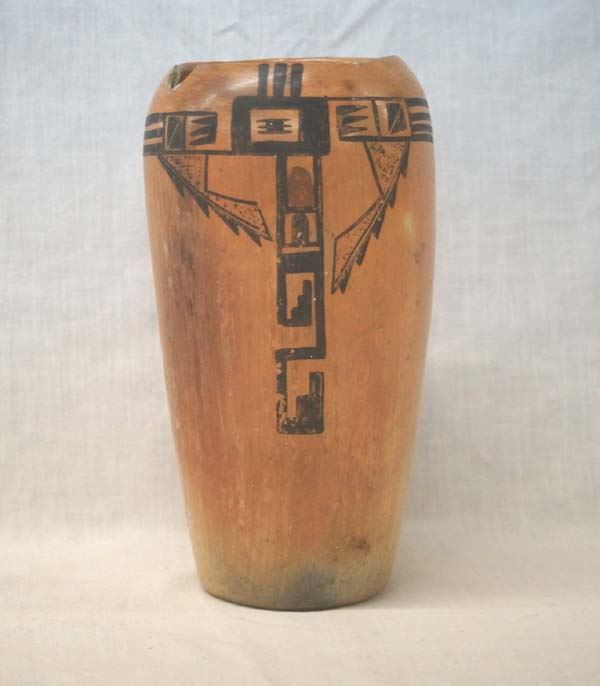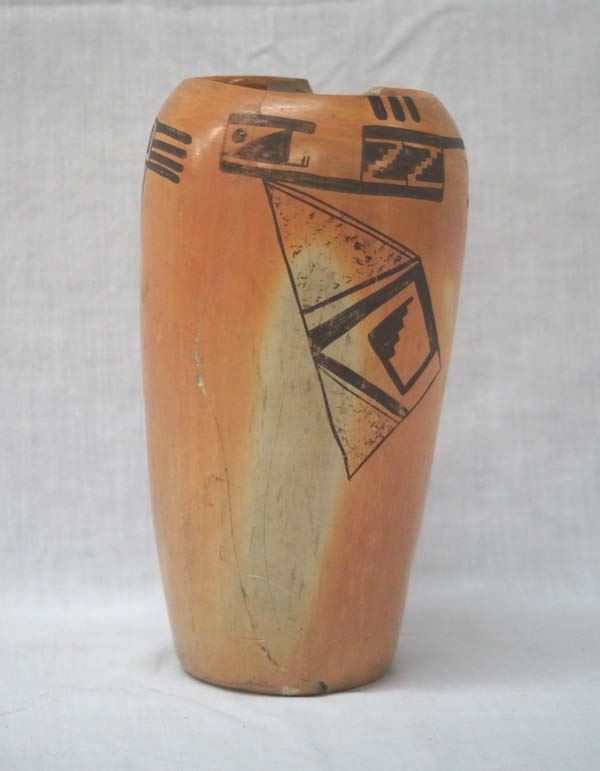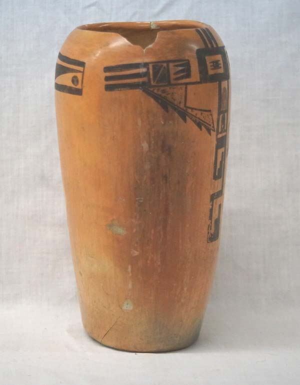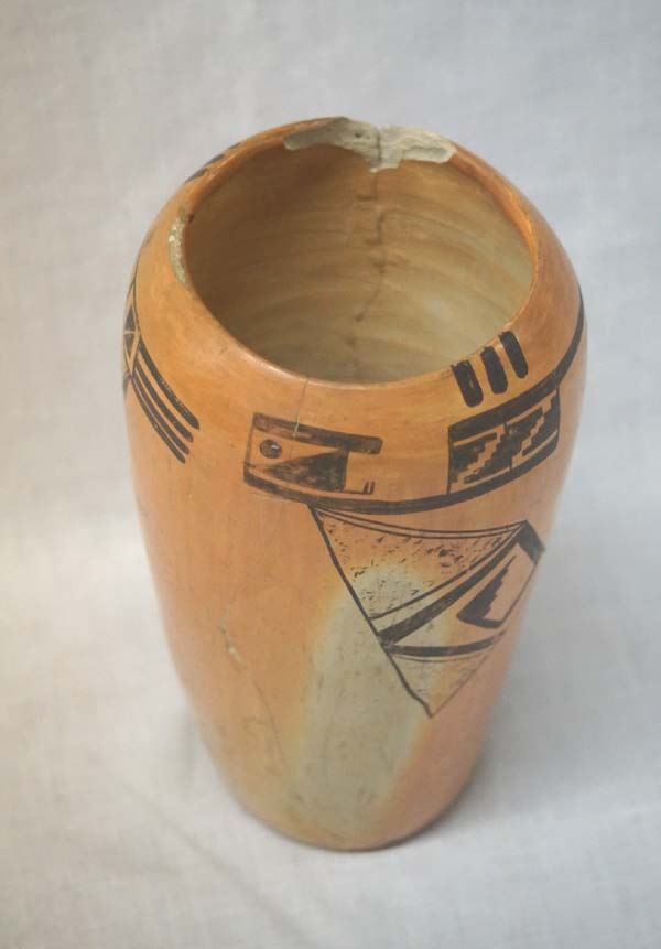 1930-1940 Native American Hopi Cylindrical Jar, measures 8.5''H x 5''D, large chip in rim, has been glued