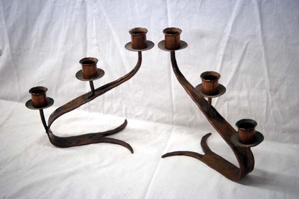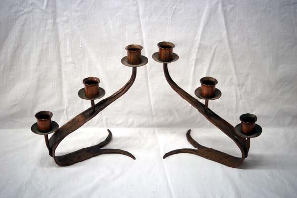 1930-1960 Hand Wrought Glander Copper Candlesticks, measure 8.5''L x 9''W, Hallmarked with a 'G' under a hand which is now Glander Ornamental Iron Works, 1580 Cold Springs Road, Saukville, Wisconsin 53080, special sheet metal works. The firm was formed by Erhard Glander in 1932 originally in West Allis, Milwaukee after arrival from Germany as a coppersmith during the 1920s. He specialised in copper and brass artworks. His son, Erhard the younger, worked side by side with him and took over the firm which continues today under the ownership of Erhard the second's children, Michael, Paul, and Lisa. In the 70's the business changed its production to large scale industrial metal work and still does specials.