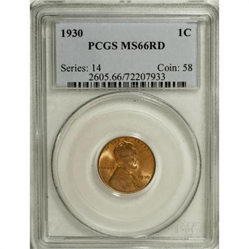 <B>1930 1C MS66 Red PCGS.</B></I> PCGS Population (854/68). NGC Census: (979/247). Mintage: 157,415,008. Numismedia Wsl. Price for NGC/PCGS coin in MS66: $80. (#2605)<BR><BR><b>Shipping:</b> Coins & Currency (<a target="_blank" href="http://www.heritageauctions.com/common/shipping.php">view shipping information</a>)