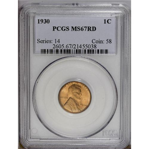 <B>1930<1C> MS67 Red PCGS.</B></I> A blazing Gem with subtle crimson and steel-blue peripheral accents. The 1930 Lincoln is a comparatively abundant issue in Mint State and they are often nice, but only rarely this well preserved. Population: 64 in 67, 1 finer (3/06).<BR><I>From The Kendall Marie #4 All-Time Finest PCGS Registry of Lincoln Cents with Varieties, Circulation Strikes, 1909-1958.</B></I> <BR><BR><B>Important notice:</B> Heritage usually auctions material at the rate of 200-250 lots per hour. On some occasions eBay Live bid software or the Internet may not be able to keep up with the pace of the auction. We recommend placing a realistic absentee bid now as insurance to avoid disappointment. Occasionally the auctioneer may eliminate or reject an eBay Live bid, and the auctioneer may also reopen a lot after the close of the eBay live bidding (usually because we missed an audience bid), and may reject your bid even if it shows you as the winning bidder. By bidding via eBay Live, you agree that Heritage may award the lot to another bidder at its sole discretion under the circumstances described above or any other reasonable circumstances. Since eBay bids are not shown to us until we open the lot on the floor, we treat those bids just like floor bids. In most cases the floor responds before the eBay bid is presented to us, due to Internet lag time, so for consistency we have made it a policy that floor bids are always considered first over tie eBay live bids. Also please note that all Heritage lots purchased through eBay Live carry a 20% Buyer's Premium. Please make sure you read the Terms and Conditions before you bid. This lot is being auctioned in conjunction with a live floor auction by Heritage Galleries & Auctioneers. All final auction and invoice information will be supplied by Heritage Galleries & Auctioneers, and all other information should be considered preliminary. Lot:527 <BR><BR><B>Winning Notification and Billing:</B> After the FINAL session in this auction is complete, Heritage will send e-mail and snail mail invoices. This process normally takes several days. All final auction and invoice information will be supplied by Heritage Galleries & Auctioneers, and all other information should be considered preliminary. <BR><BR>This auction will be conducted on a live auction floor and over the Internet through eBay Live. If you choose to place an absentee bid, please take a moment to <font color='#0000ff'><u><a href='http://pages.ebay.com/liveauctions/help/before/laabsentee.html'>learn how eBay Live absentee bidding works</a></u></font><font color='#000000'>