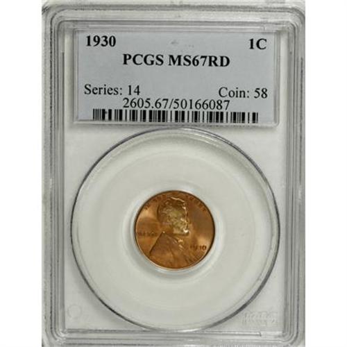 <B>1930 1C MS67 Red PCGS.</B></I> PCGS Population (69/1). NGC Census: (247/0). Mintage: 157,415,008. Numismedia Wsl. Price for NGC/PCGS coin in MS67: $600. (#2605)<BR><BR><B>Coin Engraver:</B> Victor D. Brenner<BR><BR><b>Shipping:</b> Coins & Currency (<a target="_blank" href="http://www.heritageauctions.com/common/shipping.php">view shipping information</a>)