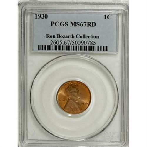 <B>1930 1C MS67 Red PCGS.</B></I> Ex: Ron Bozarth Collection. PCGS Population (69/1). NGC Census: (247/0). Mintage: 157,415,008. Numismedia Wsl. Price for NGC/PCGS coin in MS67: $600. (#2605)<BR><BR><B>Coin Engraver:</B> Victor D. Brenner<BR><BR><b>Shipping:</b> Coins & Currency (<a target="_blank" href="http://www.heritageauctions.com/common/shipping.php">view shipping information</a>)