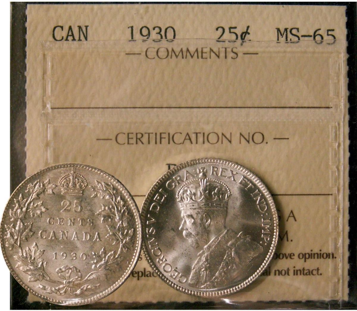 1930 25¢ ICCS MS65. Gem white with full lustre.