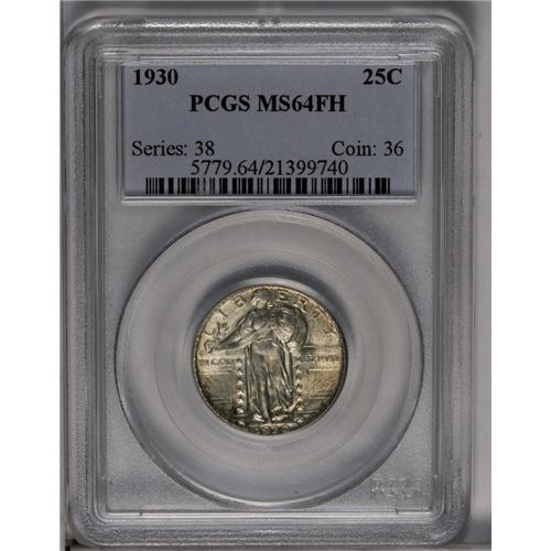 <B>1930<25C> MS64 Full Head PCGS.</B></I> Excellent striking definition and creamy, satiny luster are the highlights of this attractive example. Speckled tan and greenish patina occurs on each side, mainly near the borders, but contact marks are nonexistent.