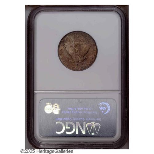 <B>1930<25C> MS65 Full Head NGC.</B></I> Shimmering luster is covered by smoky gold and lilac toning on both sides of this sharply struck Gem. Speckled dark-red patina is also noticeable on the obverse. Carefully preserved and nearly blemish-free, save for a wispy pinscratch, on the lower left reverse, that extends vertically to the right of two peripheral stars.