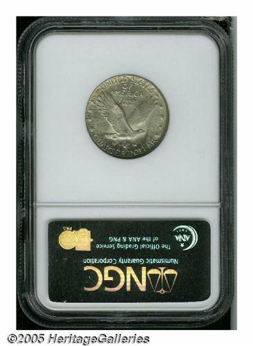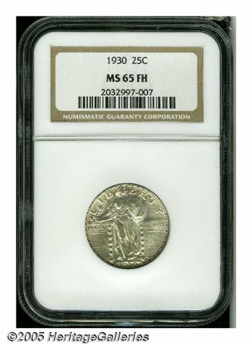 <B>1930<25C> MS65 Full Head NGC.</B></I> Silver-gray lustrous surfaces exhibit sharply struck design elements, culminating in Full Head designation. A small mark on Liberty's neck is mentioned for accuracy.
