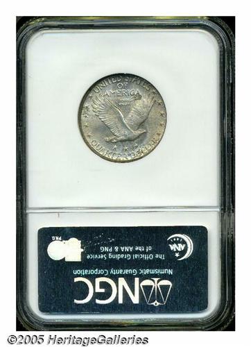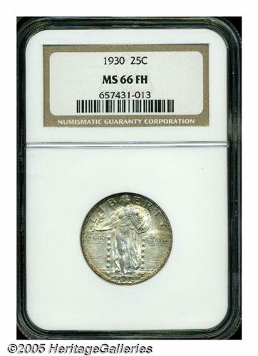 <B>1930<25C> MS66 Full Head NGC.</B></I> Lustrous surfaces reveal coppery-gold and ice-blue patination on the obverse borders, and a thin veneer of pastel magenta over the reverse. This is a nicely struck Full Head specimen, with the only weakness occurring on the lower rivets. The surfaces are virtually devoid of mentionable marks. NGC and PCGS combined have seen only 44 coins at this grade level with a Full Head designation (5/05).