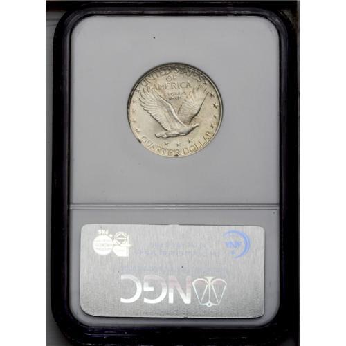 <B>1930<25C> MS66 Full Head NGC.</B></I> This issue is probably the most available of the whole Standing Liberty series in Full Head, with the exception of the 1917 Type One. This beauty is mostly untoned, with a light amber-gold patina on the obverse and a bit of reverse smoke-gray. The strike is bold on the head, but soft on the shield, with a couple of rivets missing, as usual.