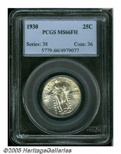 <B>1930<25C> MS66 Full Head PCGS.</B></I> The 1930 is fairly available in Full Head. The sharp strike on this Premium Gem transcends the Full Head to include most of the other design elements. Only two of the lower rivets and the lowest obverse star on the left (facing) are weak. The bright fully lustrous surfaces display a few whispers of gold-brown patina, and a handful of trivial marks on Liberty's portrait. PCGS has certified just 28 pieces finer, while NGC has seen 16 coins graded higher (6/05).