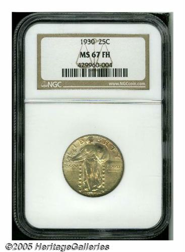 <B>1930<25C> MS67 Full Head NGC.</B></I> Wonderful. Simply wonderful quality. We make no pretense about the "rarity" of the 1930, even in this grade, but it is difficult to imagine a finer quality coin. Thick mint frost covers the immaculate surfaces and light golden, lilac, and rose toning is seen over each side. An unsurpassable type coin. Population: 16 in 67, 0 finer (5/05).