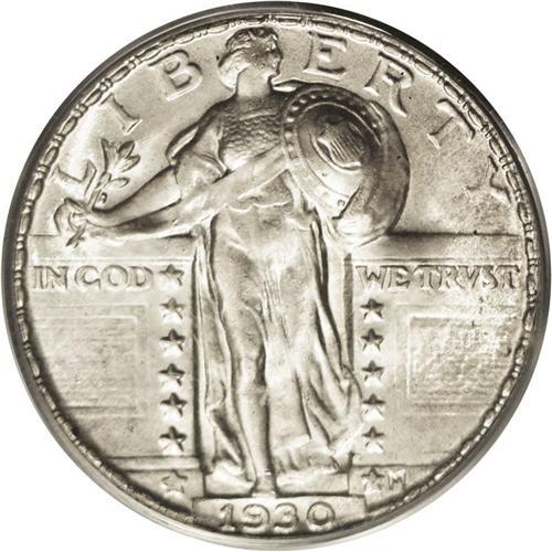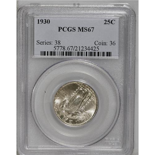 <B>1930<25C> MS67 PCGS.</B></I> Only eight 1930 Standing Liberty quarters have received an MS67 designation from NGC and PCGS (7/06). The coin that we are offering in this lot is richly frosted with silky smooth features. A dusting of pale lilac-gray iridescence blankets both sides, most areas of which are appreciably sharp in striking detail. This Superb Gem is a delight to behold, and it would make a wonderful addition to a high grade type set. Population: 4 in 67, 0 finer (7/06).