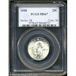 <TABLE cellSpacing=0 cellPadding=0 width="100%" bgColor=#000000 border=0><TBODY><TR><TD width="100%"><TABLE cellSpacing=1 cellPadding=3 width="100%" border=0><TBODY><TR><TD width="100%" bgColor=#79735c><FONT face=arial color=#ffffff size=3><B>Description</B> </FONT></TD></TR><TR><TD width="100%" bgColor=#ffffff><FONT face=arial size=2><B>1930 25C MS67 PCGS.</B></I> This is a thickly frosted Superb Gem with uncommonly smooth surfaces for this otherwise readily obtainable P-mint delivery. The strike, while not quite full over Liberty's head, is well above average for the type. A few tiny nicks on Liberty's left (facing) leg, and one small notch on the eagle's lower torso, are the only surface blemishes. NGC and PCGS combined have seen just seven coins in MS67, and none finer (4/03). </FONT></TD></TR></TBODY></TABLE></TD></TR></TBODY></TABLE><BR><A name=PricesRealized></A><TABLE cellSpacing=0 cellPadding=0 width="100%" bgColor=#000000 border=0><TBODY><TR><TD width="100%"><TABLE cellSpacing=1 cellPadding=3 width="100%" border=0><TBODY><TR><TD width="100%" bgColor=#79735c><A name=PR><FONT face=arial color=#ffffff size=3><B>Previous Prices from Heritage Auctions</B> </FONT></A></TD></TR><TR><TD bgColor=#f6f6ed><TABLE cellSpacing=0 cellPadding=0 width="100%" border=1><TBODY><TR><TD align=middle width="33%"><B>Date</B></TD><TD align=middle width="33%"><B>Service</B></TD><TD align=middle width="33%"><B>Price</B></TD></TR><TR bgColor=whitesmoke><TD width="33%"><B>08/02/1997</B></TD><TD width="33%">NGC</TD><TD width="33%">$1,495.00</TD></TR></TBODY></TABLE></TD></TR><TR><TD bgColor=#ffffff><FONT face=arial size=1 ?>PLEASE NOTE: All prices realized reflect the final hammer price PLUS the buyer's premium in auctions that charge a buyer's premium. Each item has a notation at the top of the listing indicating whether that lot included a buyer's premium. Example: A item that sells with a final hammer price of $100 and a 20% buyer's premium will display with a price realized of $120. All information listed is intended to be as accurate as possible, but errors are possible. Please use this guide carefully and inform us of any inaccuracies. </FONT></TD></TR></TBODY></TABLE></TD></TR></TBODY></TABLE><BR><TABLE cellSpacing=0 cellPadding=0 width="100%" bgColor=#000000 border=0><TBODY><TR><TD width="100%"><TABLE cellSpacing=1 cellPadding=3 width="100%" border=0><TBODY><TR><TD width="100%" bgColor=#79735c colSpan=6><FONT face=arial color=#ffffff size=3><B>Price Guide*</B> </FONT></TD></TR><TR bgColor=#f6f6ed><TD align=middle><B>Grade</B> </TD><TD align=middle><B>Coin World<BR>(Trends)</B> </TD><TD align=middle><B>Numismedia<BR>Retail</B> </TD><TD align=middle><B>Numismedia<BR>Wholesale</B> </TD><TD align=middle><B>Coin<BR>Universe</B> </TD><TD align=middle><B>Heritage<BR>Value Index</B> </TD></TR><TR bgColor=#ffffff><TD align=middle>66</TD><TD align=right>---</TD><TD align=right>$880.00</TD><TD align=right>$700.00</TD><TD align=right>$775.00</TD><TD align=right>$542.50</TD></TR><TR style="FONT-WEIGHT: bold" bgColor=#cccfdd><TD align=middle>67</TD><TD align=right>---</TD><TD align=right>---</TD><TD align=right>$2,625.00</TD><TD align=right>---</TD><TD align=right>---</TD></TR><TR bgColor=#ffffff><TD align=middle>68</TD><TD align=right>---</TD><TD align=right>---</TD><TD align=right>---</TD><TD align=right>---</TD><TD align=right>---</TD></TR><TR bgColor=#ffffff><TD colSpan=6><FONT size=1>*All information listed is intended to be as accurate as possible, but errors are possible. No item may be returned or refused based on this information which is provided as a service to our customers. You should contact each pricing source directly to determine the accuracy of this information. </FONT></TD></TR></TBODY></TABLE></TD></TR></TBODY></TABLE><BR><TABLE cellSpacing=0 cellPadding=0 width="100%" bgColor=#000000 border=0><TBODY><TR><TD width="100%"><TABLE cellSpacing=1 cellPadding=3 width="100%" border=0><TBODY><TR><TD width="100%" bgColor=#79735c><FONT face=arial color=#ffffff size=3><B>Population Guide</B> </FONT></TD></TR><TR bgColor=#ffffff><TD align=middle><!-- Begin Output of Population Grid--><TABLE cellSpacing=0 cellPadding=0 width="100%" border=0><TBODY><TR><TD vAlign=center><TABLE cellSpacing=0 width="100%" border=1 cellsadding="3"><TBODY><TR><TD vAlign=center><TABLE cellSpacing=0 cellPadding=3 width="100%" border=1><TBODY><TR><TD vAlign=center align=middle bgColor=#f0f1e8 colSpan=2 <CENTER><FONT face=Arial size=2><B>PCGS Pop </B></FONT><CENTER></CENTER></TD><TD vAlign=center align=middle bgColor=#f0f1e8 colSpan=2><CENTER><FONT face=Arial size=2><B>NGC Pop</B></CENTER></FONT></TD></TR><TR><TD vAlign=center><FONT face=Arial size=2>(67)</FONT> </TD><TD vAlign=center align=right><FONT face=Arial size=2>3</FONT> </TD><TD vAlign=center><FONT face=Arial size=2>(67)</FONT> </TD><TD vAlign=center align=right><FONT face=Arial size=2>4</FONT> </TD></TR><TR><TD vAlign=center><FONT face=Arial size=2>(>67)</FONT> </TD><TD vAlign=center align=right><FONT face=Arial size=2>0</FONT> </TD><TD vAlign=center><FONT face=Arial size=2>(>67)</FONT> </TD><TD vAlign=center align=right><FONT face=Arial size=2>0</FONT> </TD></TR></TBODY></TABLE></TD></TR></TBODY></TABLE></TD></TR></TBODY></TABLE><!-- End Output of Population Grid--> Important notice: Heritage usually auctions material at the rate of 200-250 lots per hour. On some occasions eBay Live bid software or the Internet may not be able to keep up with the pace of the auction. We recommend placing a realistic absentee bid now as insurance to avoid disappointment. Occasionally the auctioneer may eliminate or reject an eBay Live bid, and the auctioneer may also reopen a lot after the close of the eBay live bidding (usually because we missed an audience bid), and may reject your bid even if it shows you as the winning bidder. By bidding via eBay Live, you agree that Heritage may award the lot to another bidder at its sole discretion under the circumstances described above or any othe