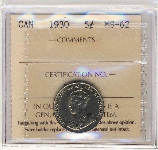 1930 5¢ ICCS MS62. Tough date in mintstate.